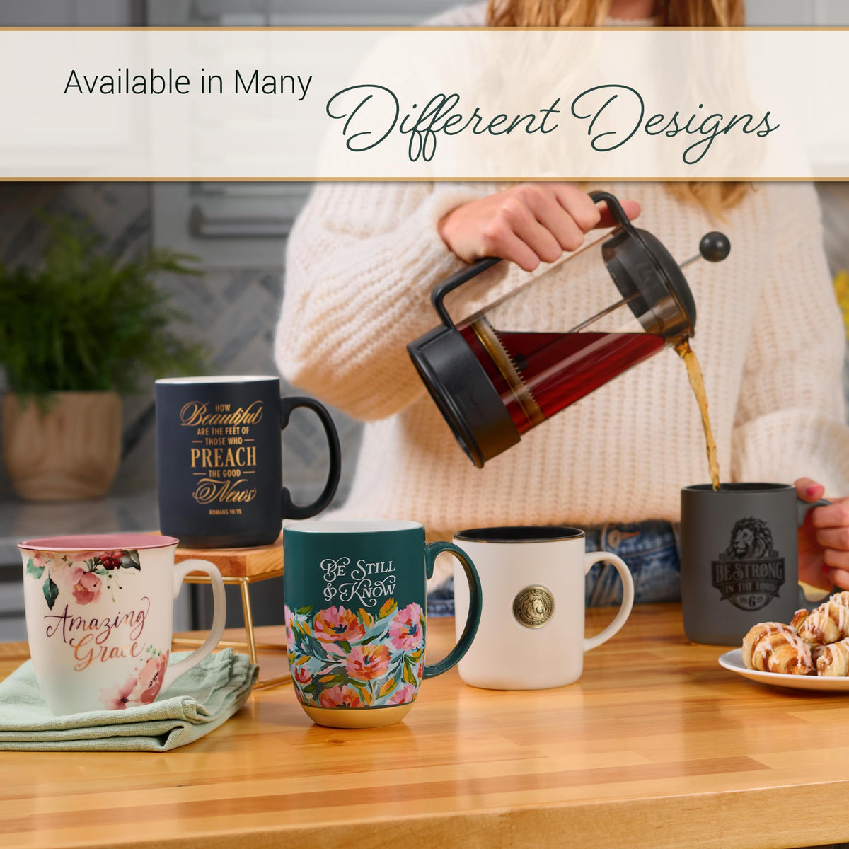 • Q: What is the design on the mug? A: The mug features the 'Be Strong' Bible verse, which is a motivating and inspirational message.