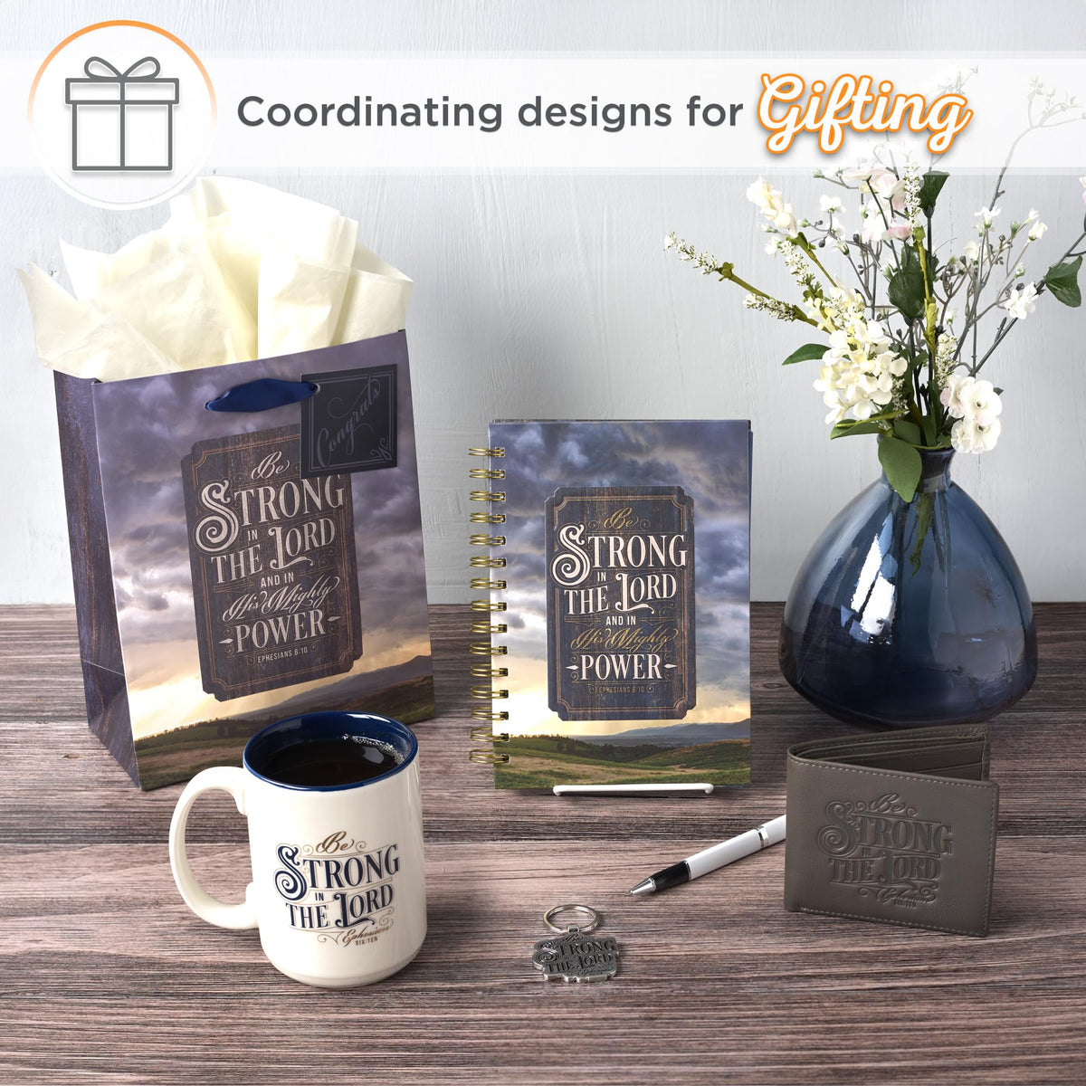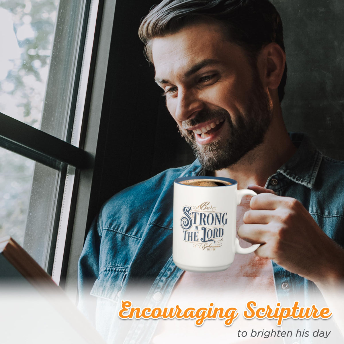 Christian Art Gifts Large Ceramic Coffee & Tea Mug for Men & Women: Strong in the Lord Bible Verse, White & Blue, 14 oz.