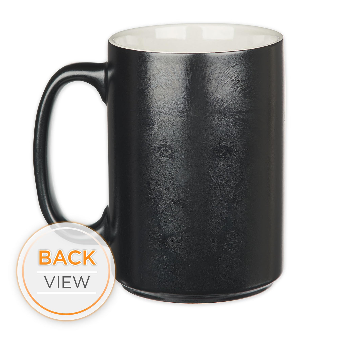 - Q: What design features does the mug have? A: The mug features a bold, white lined multi-font text with the scripture passage Joshua 1:9 on the front and an elegant, glossy printed lion's face on the back.