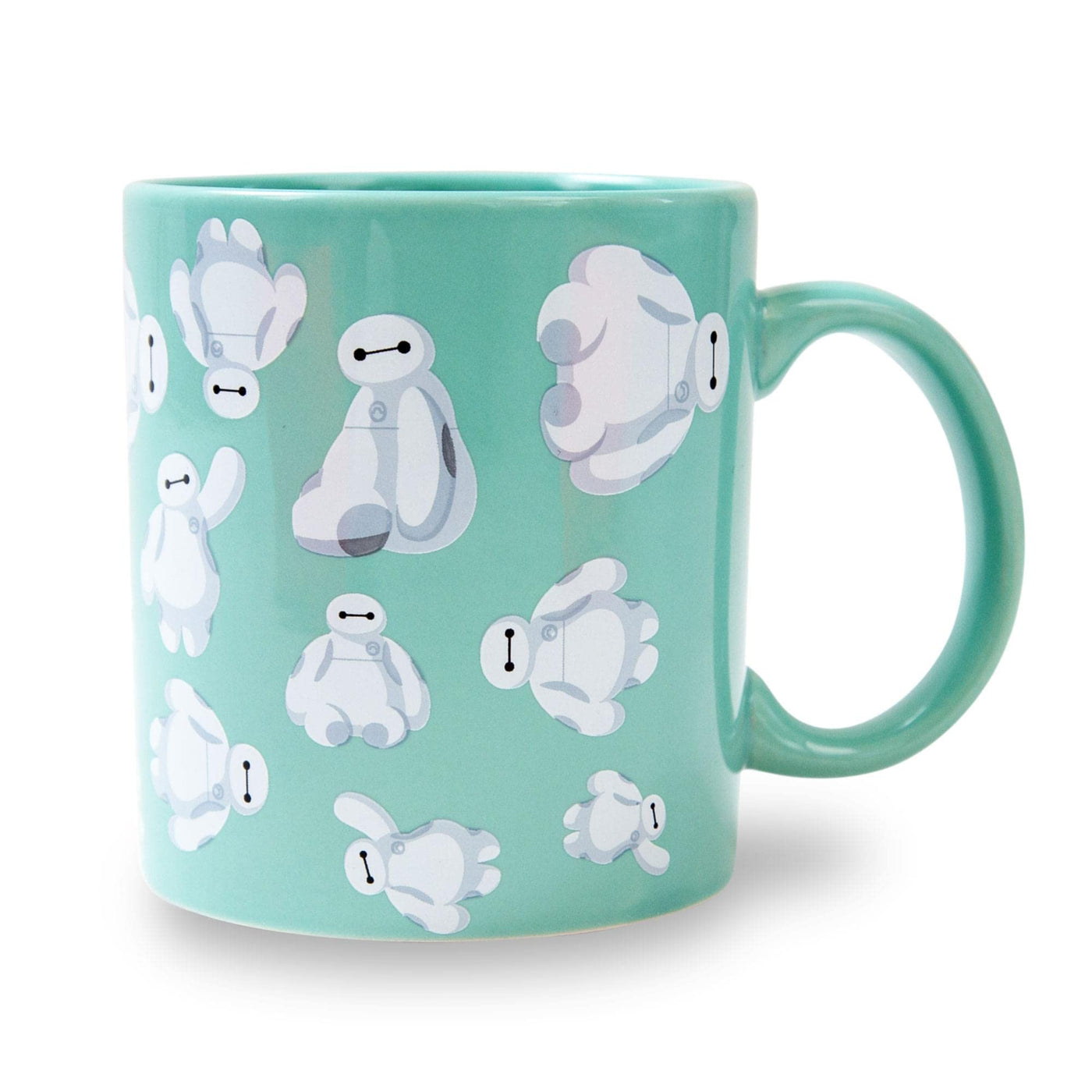 • Q: What design features does the Baymax mug have? A: The mug features Baymax in his unarmored form on a teal background, with a repeating pattern of the character in various poses.