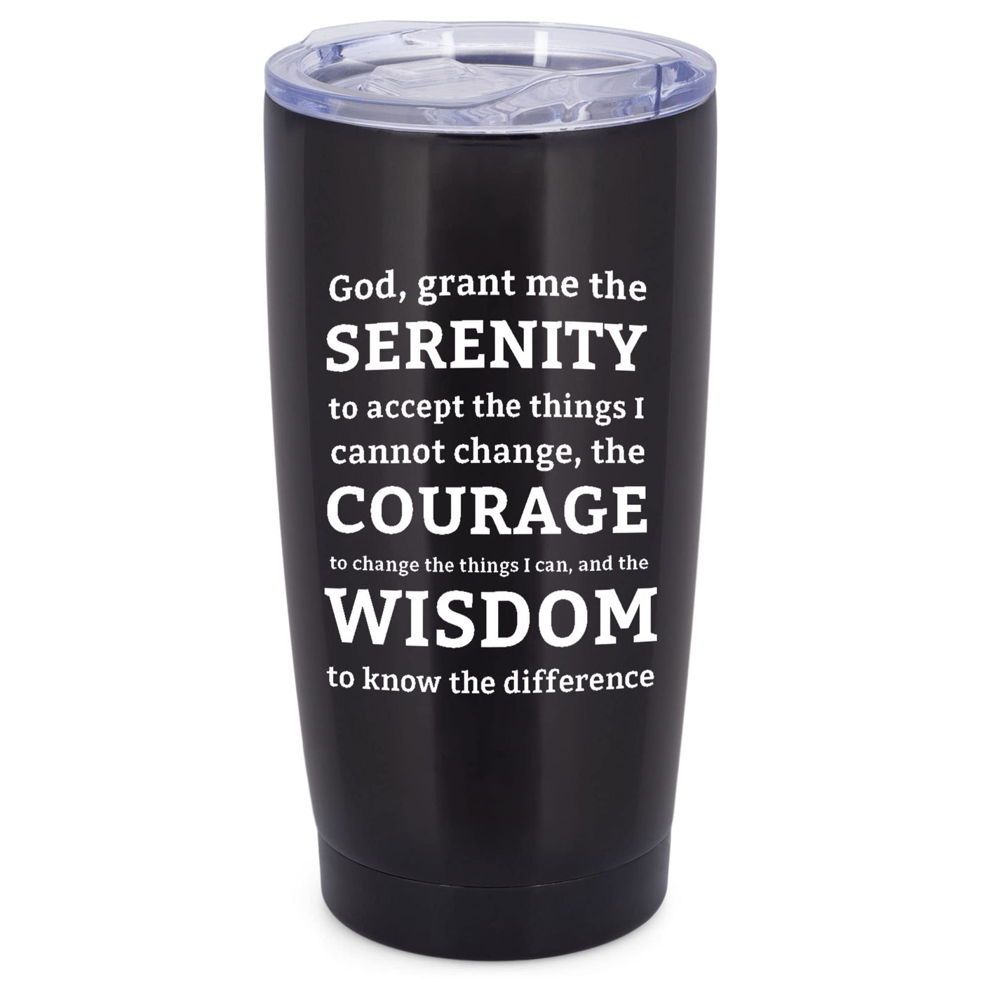 • Q: What is the design on the tumbler? A: The tumbler features the Serenity Prayer printed in a trendy font, along with a cross image on the opposite side.