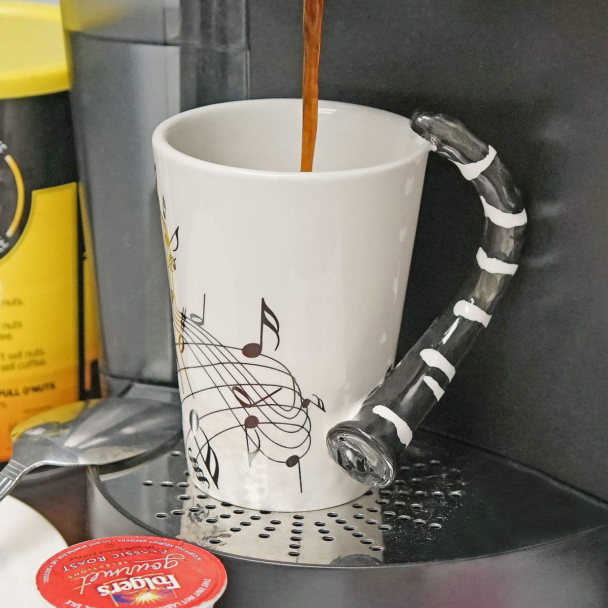 • Q: Does the mug have any special design features? A: Yes, it features a clarinet-shaped handle and musical measure decorations, adding a unique touch to your drinkware.