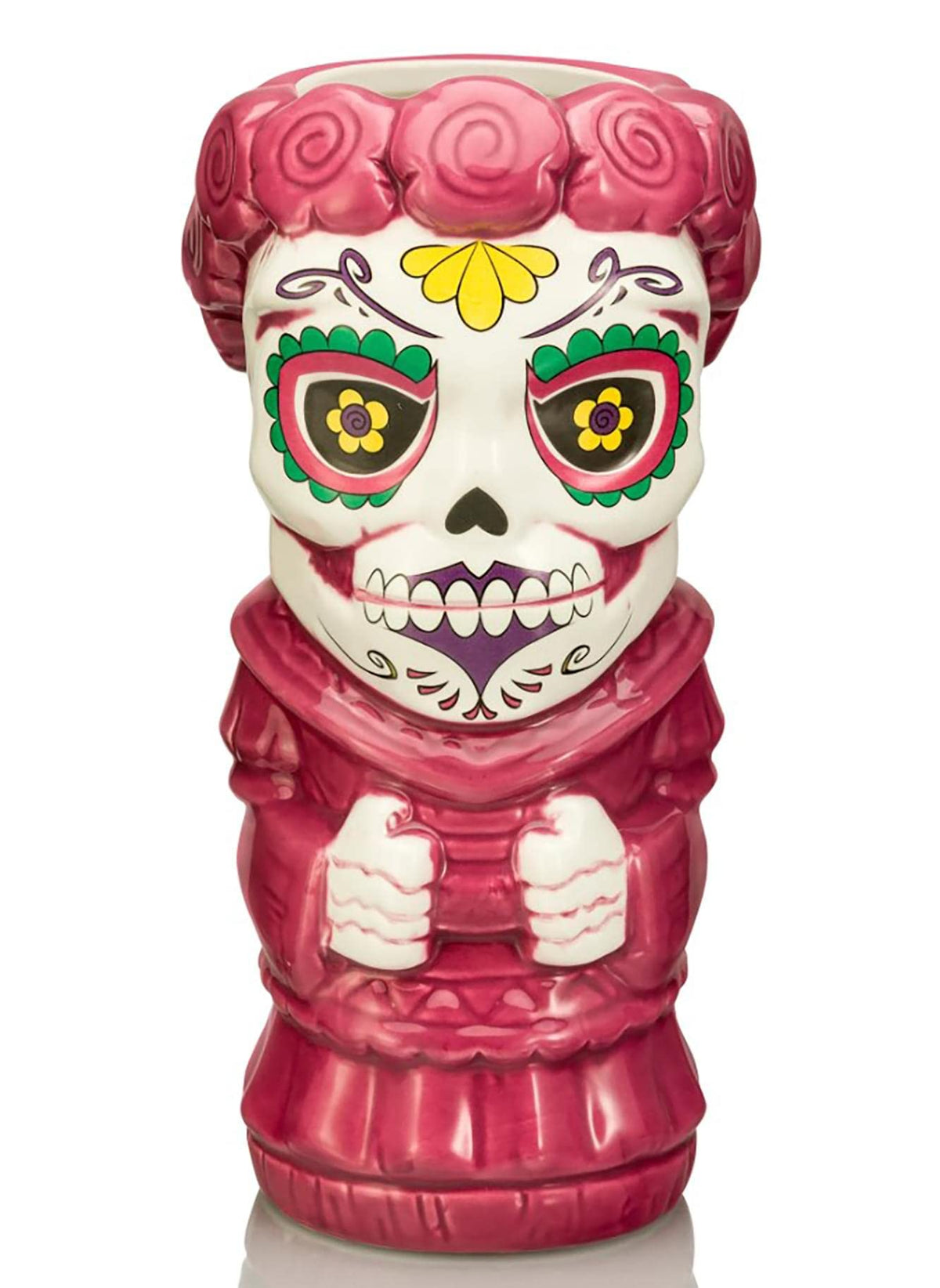 • Q: Does the mug feature any designs? A: Yes, it features a beautifully sculpted calavera (skull) with vibrant colors representing the vitality of the departed.
