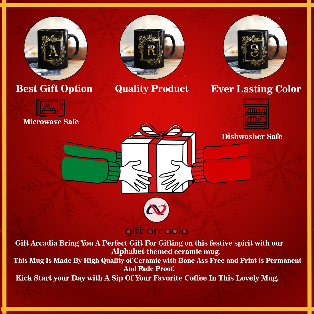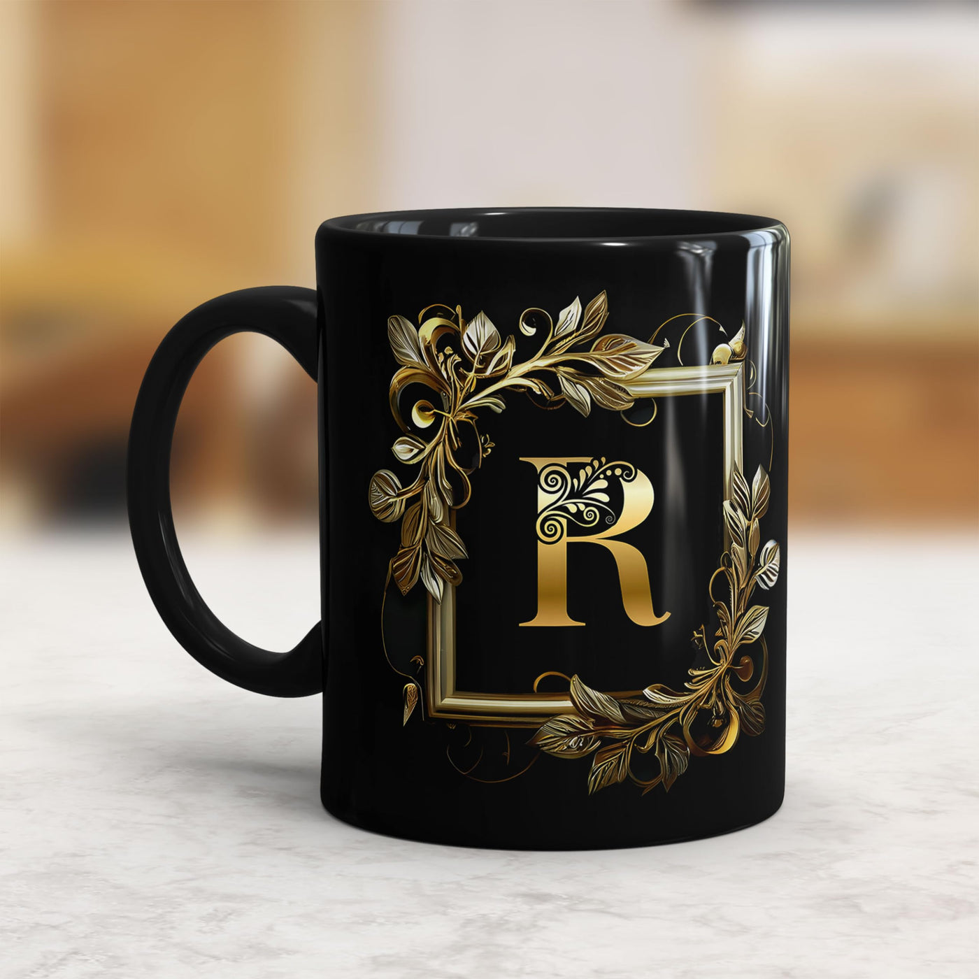 Gift Arcadia Golden Floral Alphabet Letter R Printed Coffee Mug Gift For Girl, Boy,Wife,Husband,Girlfriend Boyfriend,Kids,Brother,Sister,Love And Valentines Day - 1Pcs, Black, 330Ml (Al-R)
