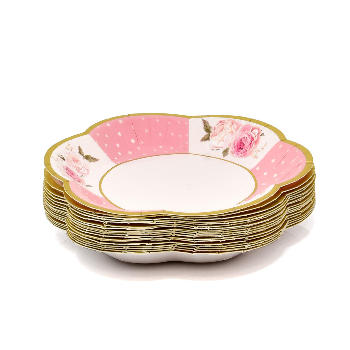 - Q: What designs are featured on the cups and saucers? A: The cups and saucers feature coordinating designs with pink and white dots combined with gold foil flowers, adding a charming touch to your party.