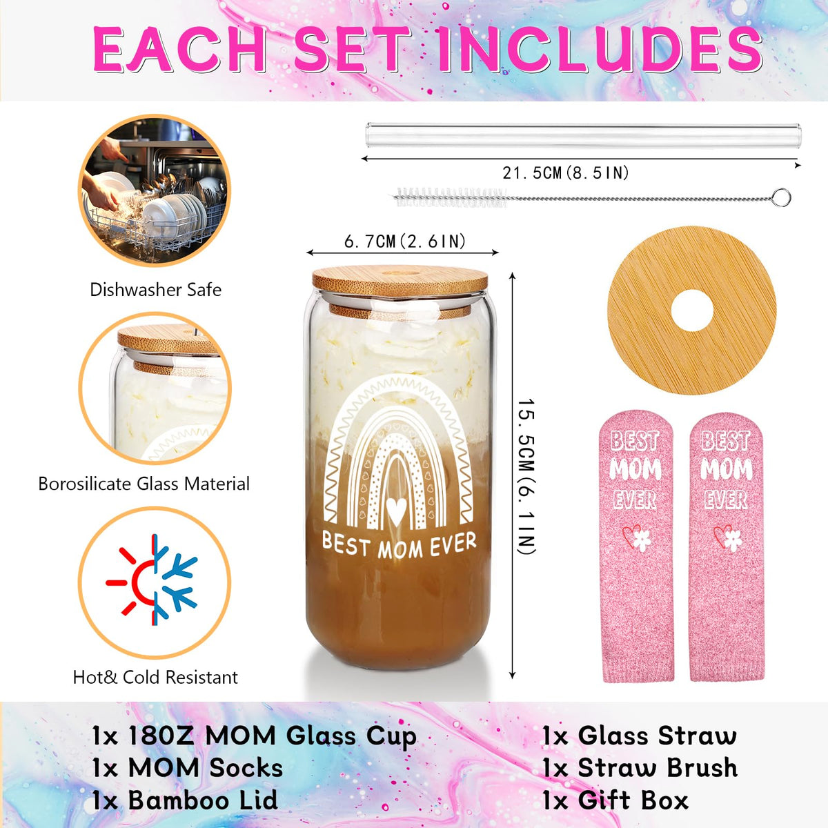 • Q: What is included in the gift set for Mom? A: The gift set includes a glass cup and a pair of socks, making it a thoughtful and practical gift for various occasions.