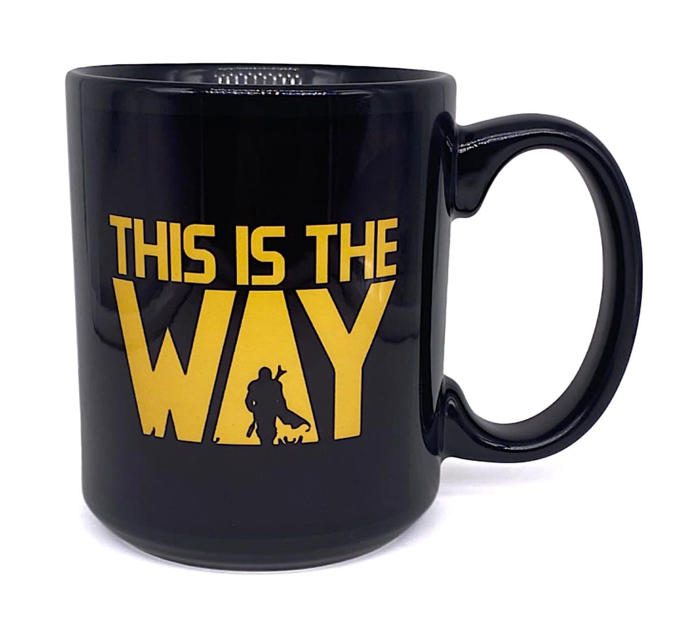 • Q: What design features does the mug have? A: The mug features Din Djarin, also known as Mando, along with his iconic 'THIS IS THE WAY' quote from The Mandalorian TV series.