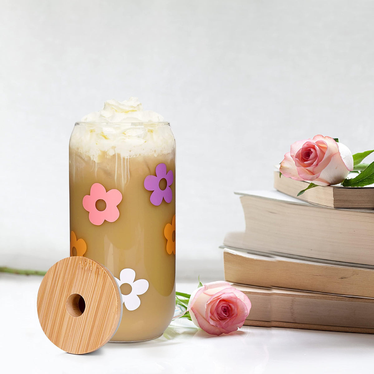 Mason Life Cute Glass Cups With Lids And Straws, Valentine 'S Day Gift For Women, 18Oz Aesthetic Cups Iced Coffee Cups, Flower C