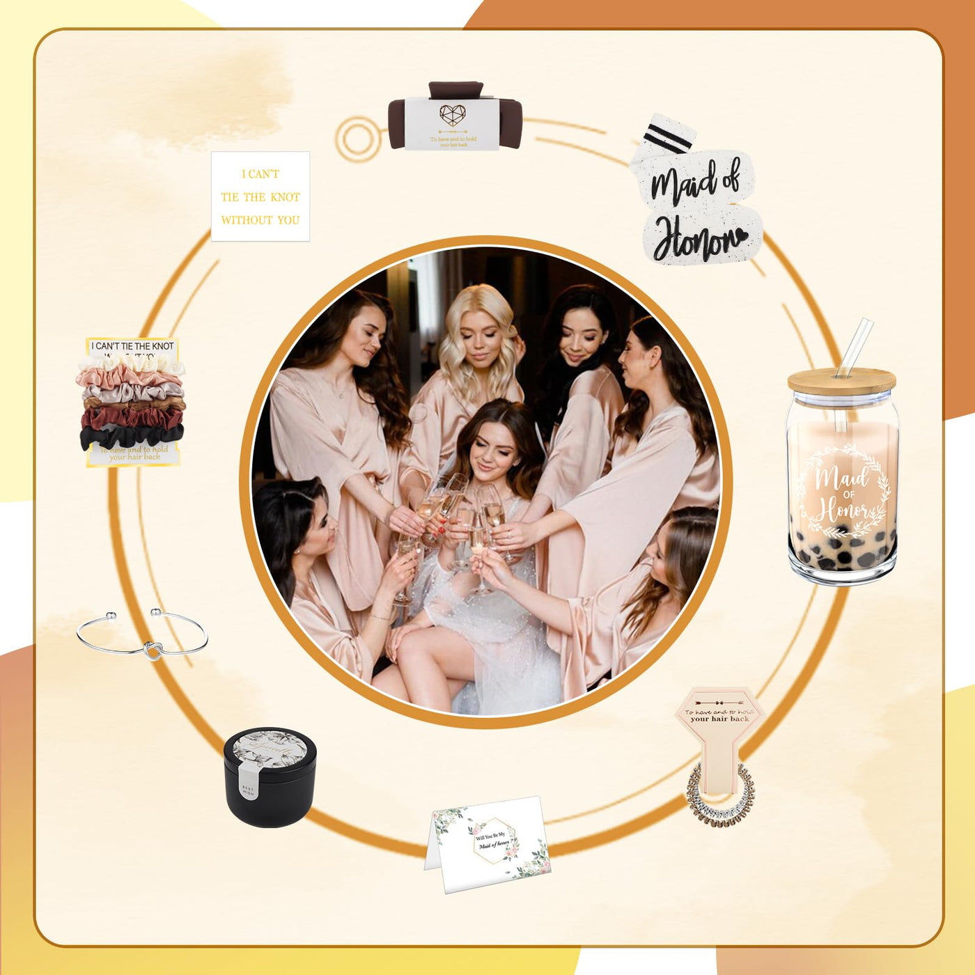 • Q: What items are included in the Mhoel Bridesmaid Proposal Box Gifts Set? A: The Mhoel Bridesmaid Proposal Box Gifts Set includes 40 pieces: 4 glass cups, 4 satin scrunchies, 4 champagne spiral hair ties, 4 large hair claw clips, 4 glass straws, 4 'I CAN’T TIE THE KNOT WITHOUT YOU' cards, 4 knotted bracelets, 4 scented candles, 3 pairs of soft socks, and 1 maid of honor sock.