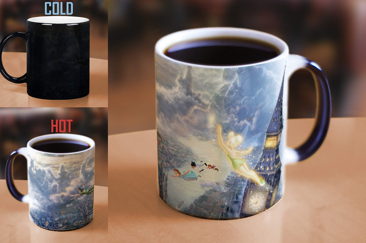 - Q: What kind of design is featured on the mug? A: The mug features a panoramic painting of Tinker Bell and Peter Pan flying to Neverland, styled by artist Thomas Kinkade.