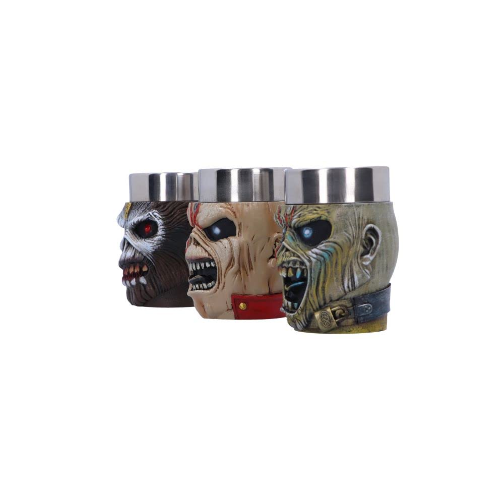 • Q: What is included in the Nemesis Now Shot Glass Collection? A: The Nemesis Now Shot Glass Collection includes a set of three hand-painted shot glasses featuring the Iron Maiden figurehead Eddie, inspired by the albums 'Book of Souls', 'Piece of Mind', and 'The Trooper'.