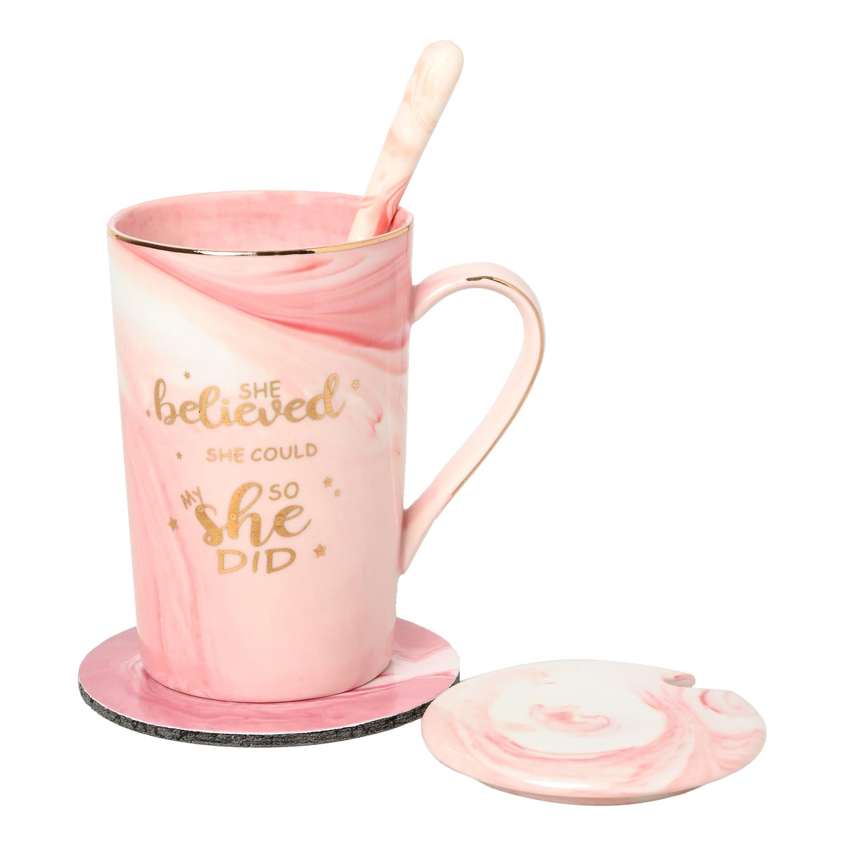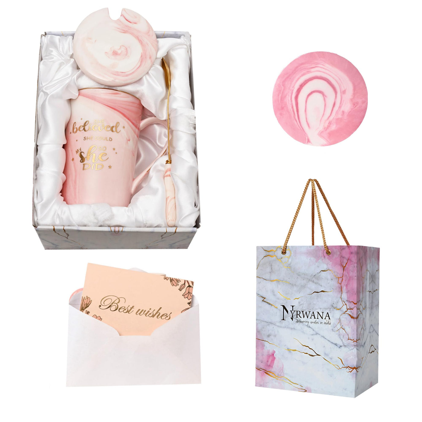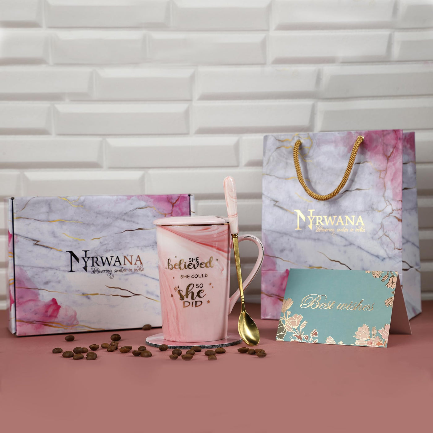 DescriptionNYRWANA DELIVERING SMILES IN INIDA She believed She Could So She Did Mug, Graduation Gift for Her, Inspirational Spiritual Motivational Congratulations Gifts for Women, Gift for Mothers Day, Birthday, Christmas 400 ml with Gift Box