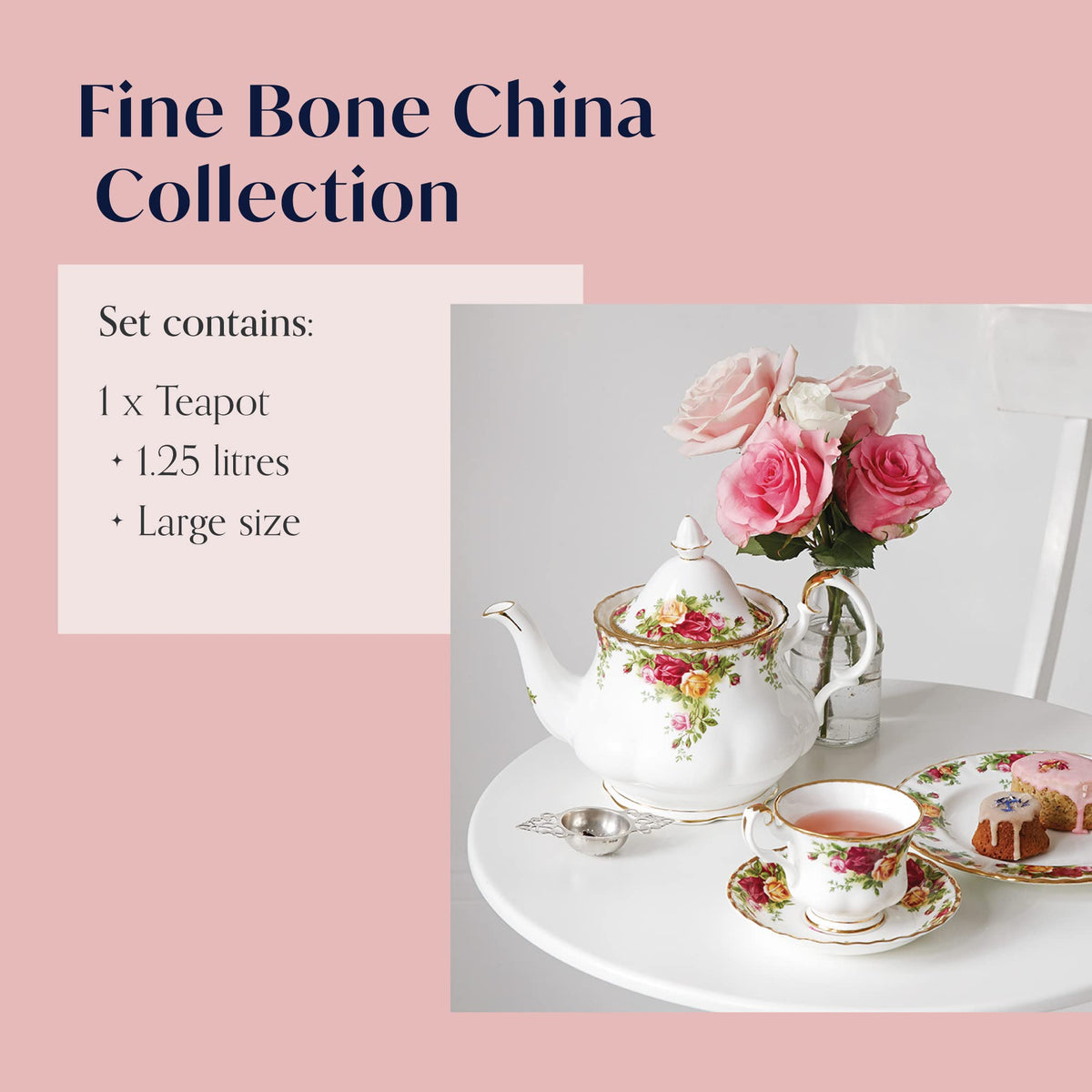 • Q: What is the capacity of the Royal Albert Old Country Roses Teapot? A: The Royal Albert Old Country Roses Teapot has a capacity of 48 ounces, making it ideal for serving tea during gatherings or afternoon tea.