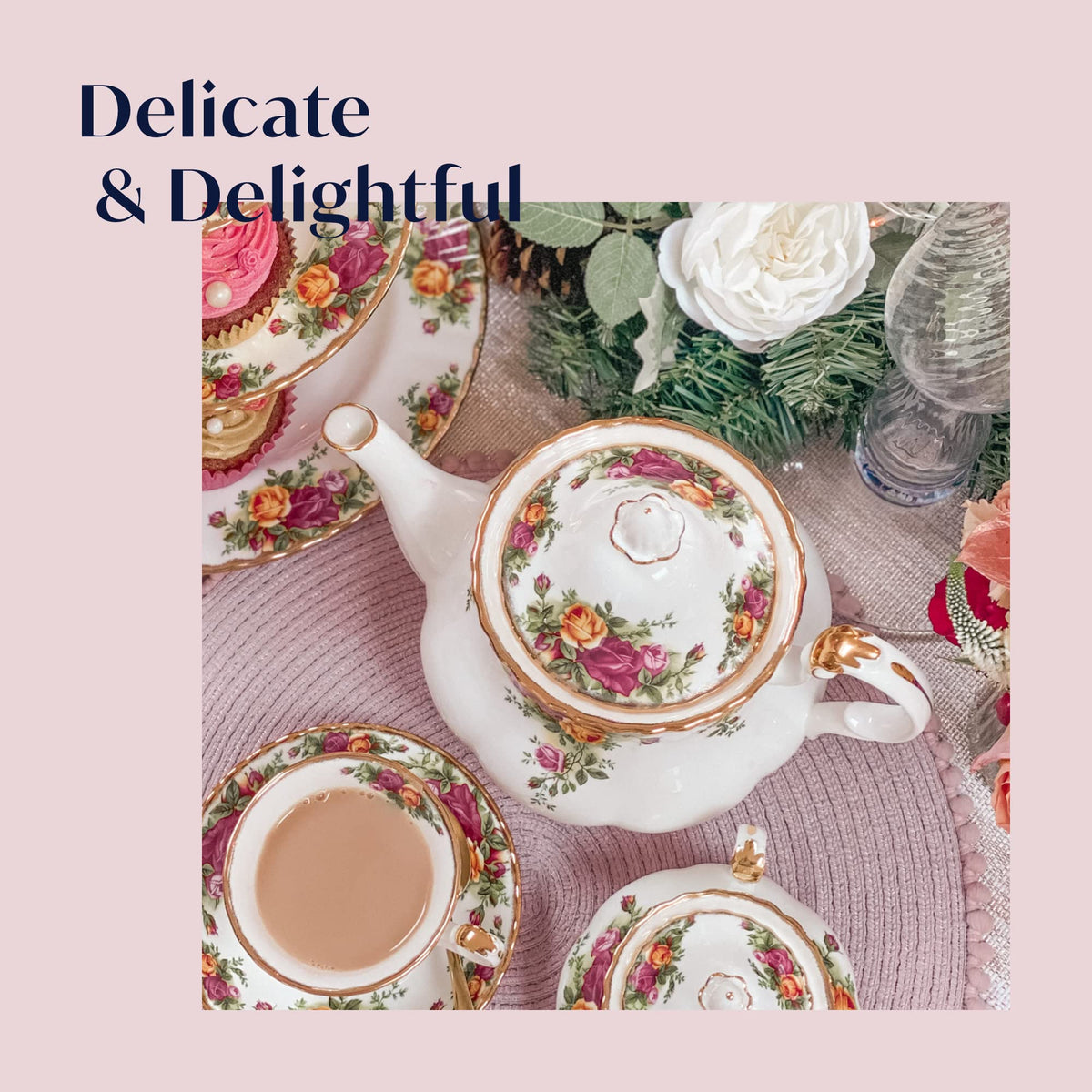 • Q: What is the design style of the Old Country Roses Teapot? A: The design features a classic English garden motif with cascading country roses in shades of burgundy, pink, and soft yellow, accented with 22-carat gold.