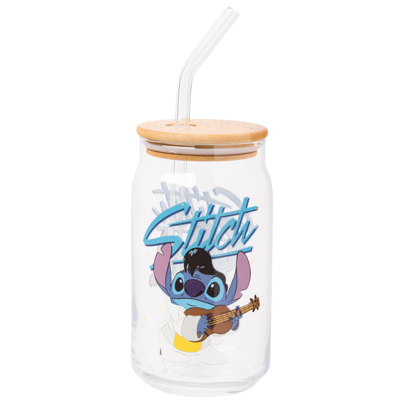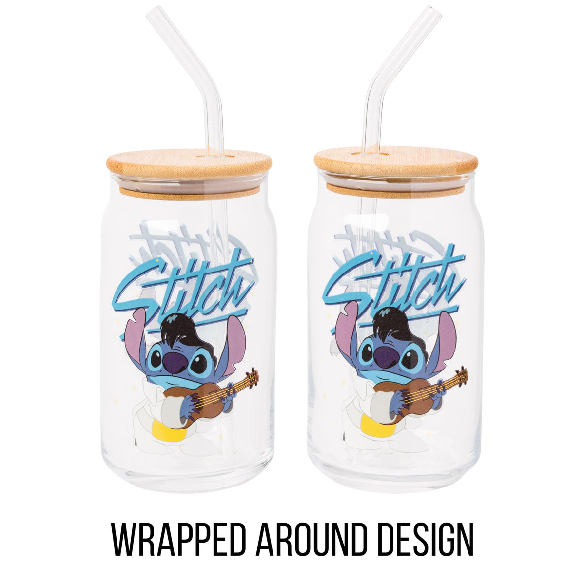 Silver Buffalo Disney Lilo and Stitch Glass Tumbler with Bamboo Lid and Glass Straw Featuring Stitch in an Elvis Costume, 16 Oun
