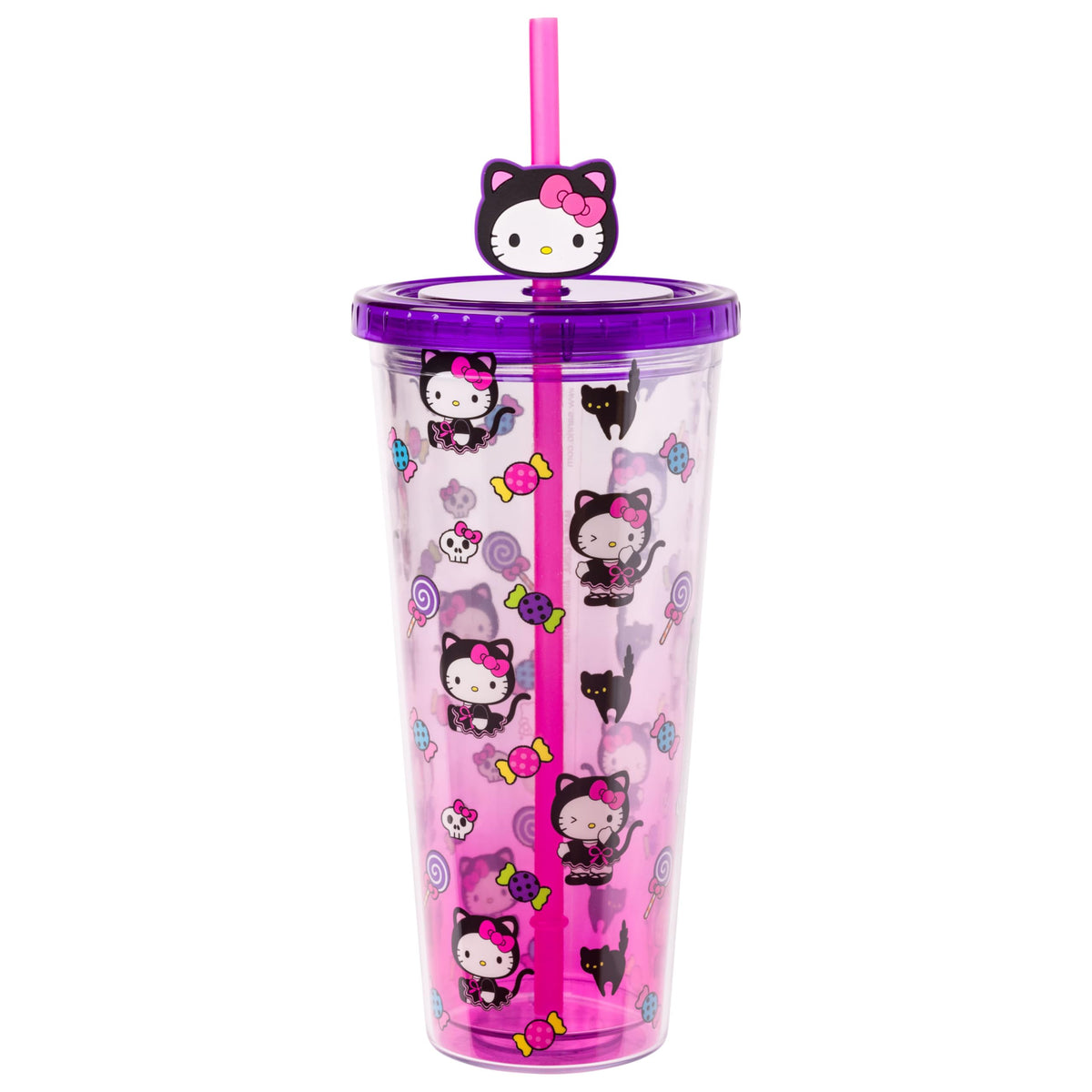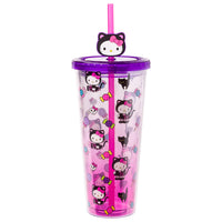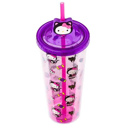 Silver Buffalo Sanrio Hello Kitty Halloween Costume Black Cat and Candy Plastic Cold Cup with Lid and Straw Topper, 24 Ounces