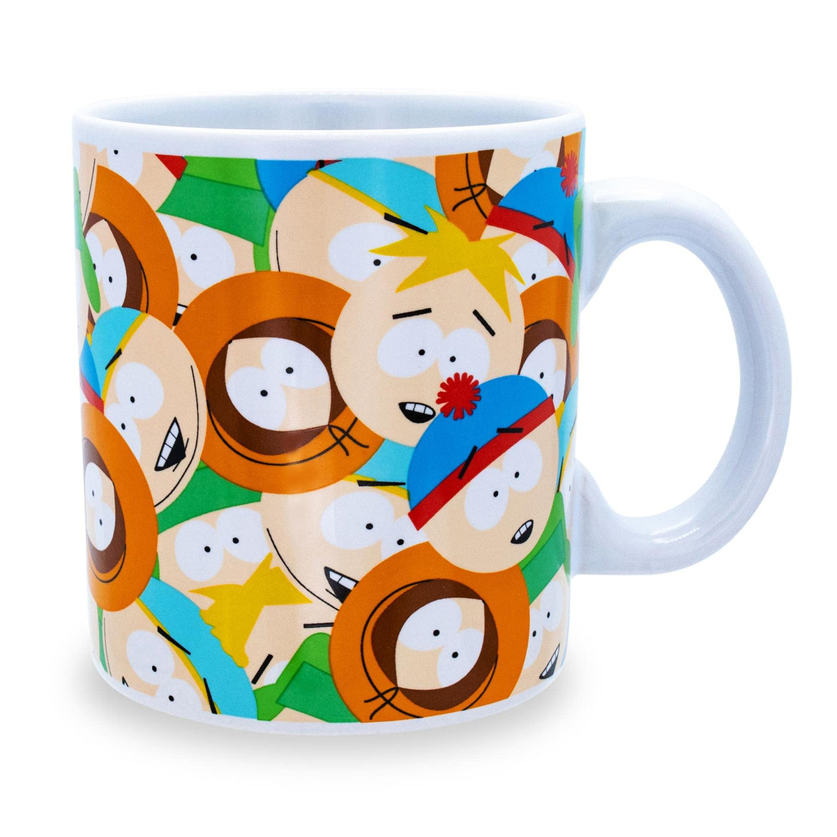 • Q: What characters are featured on the mug? A: The mug features the faces of the four main characters from South Park: Stan Marsh, Kyle Broflovski, Eric Cartman, and Kenny McCormick.