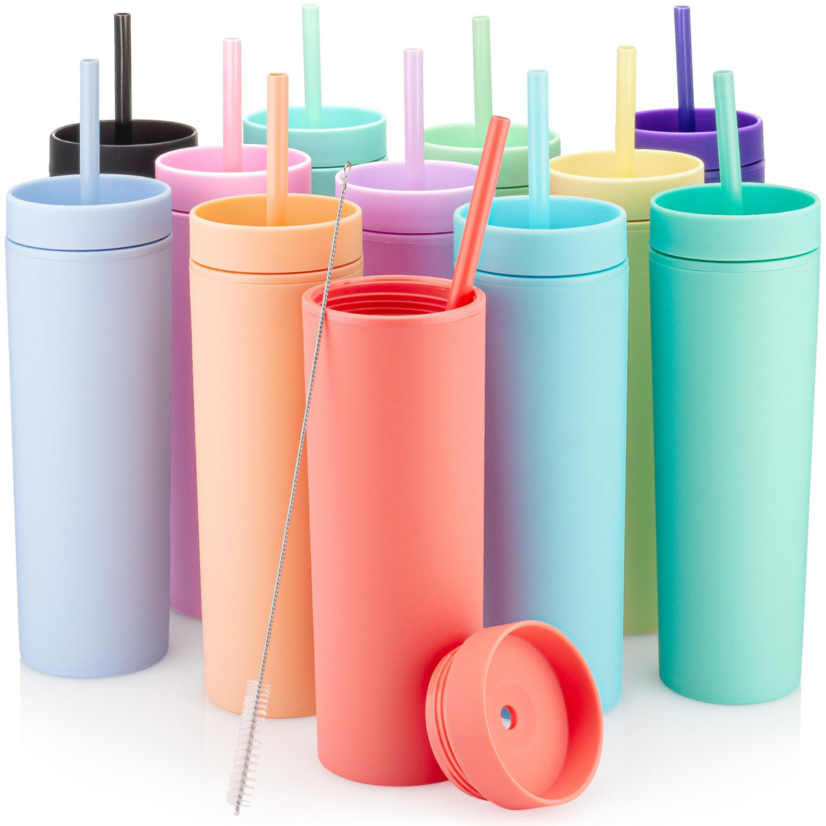 • Q: How many cups are included in the pack? A: The pack includes 12 multicolor skinny tumblers.