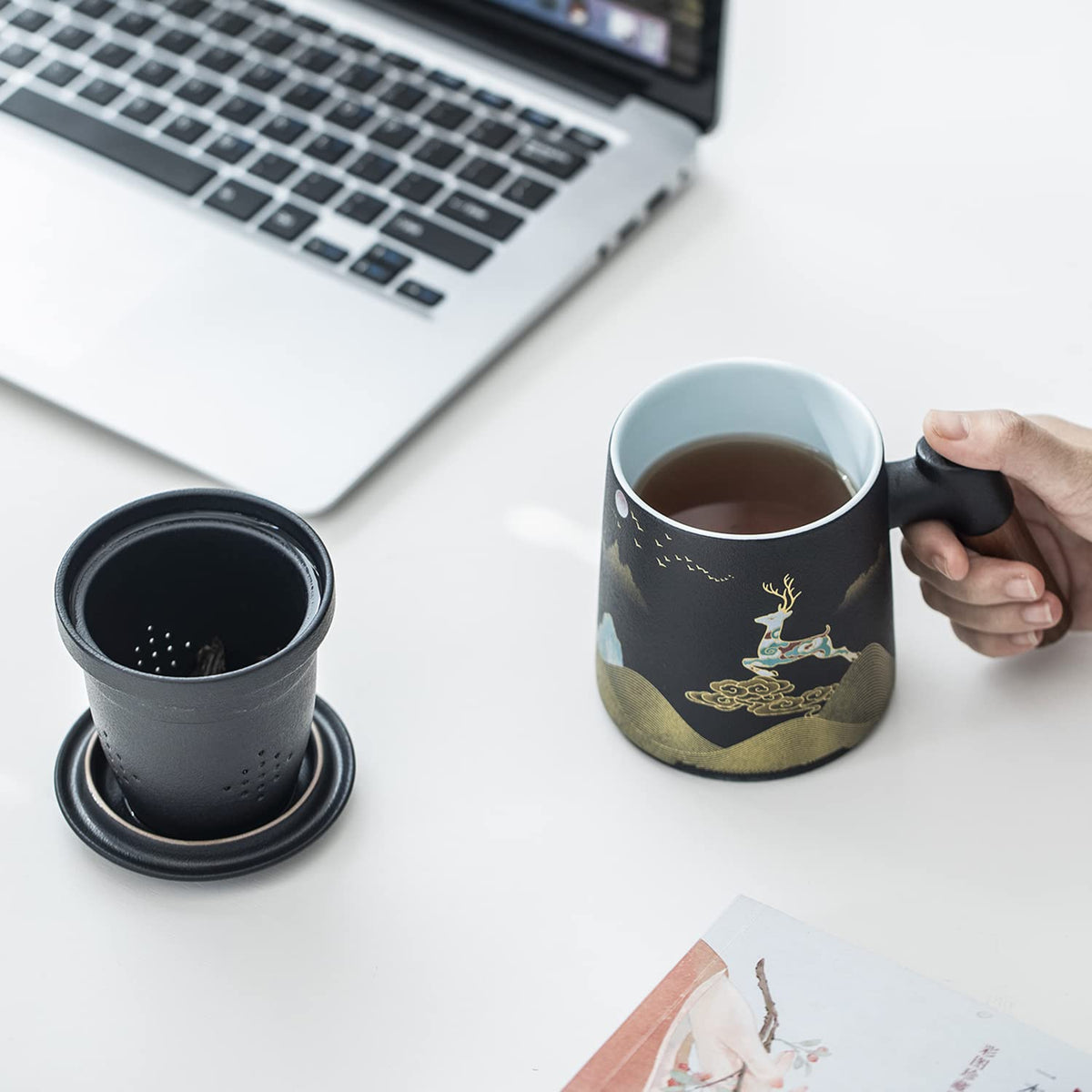 Taoci Ceramic Tea Mug With Infuser And Lid Tea Cup Moon Deer Mountain Creative Embossed Design Coffee Mug With Strainer And Wood