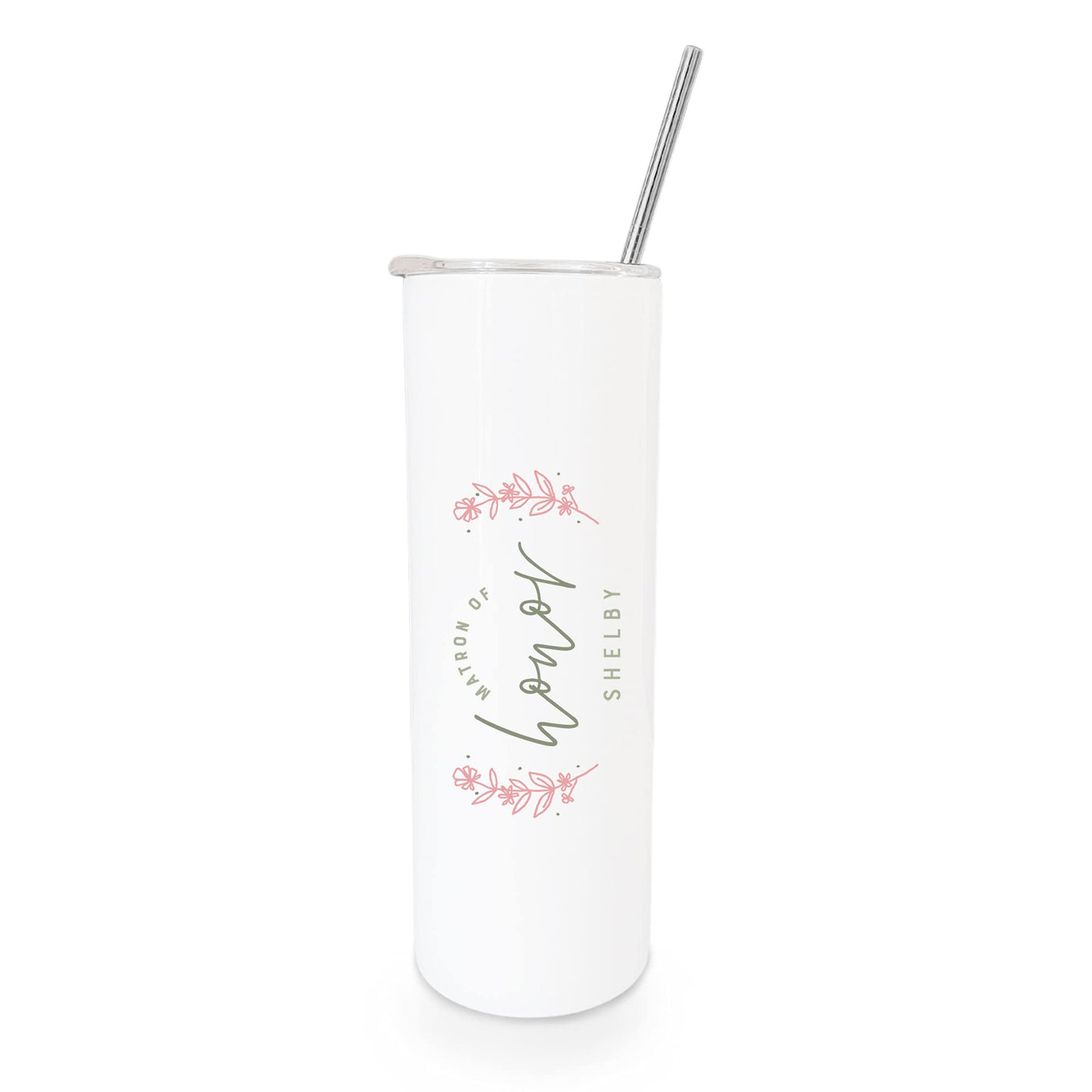 The Cotton & Canvas Co. Personalized Name Floral Matron Of Honor Insulated Stainless Steel Wedding Tumbler With Metal Straw, Mat