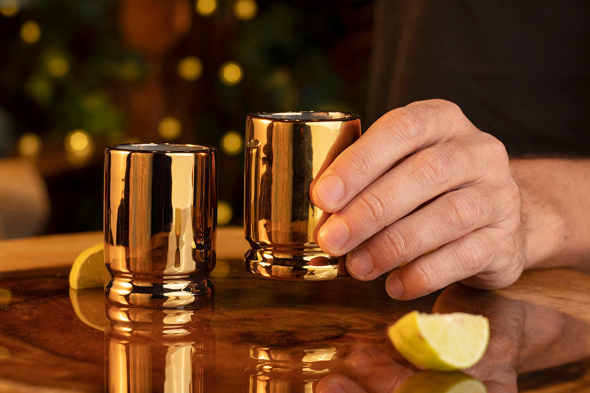 • Q: What material are the shot glasses made of? A: The shot glasses are made of high-quality brass, ensuring durability and a unique appearance.