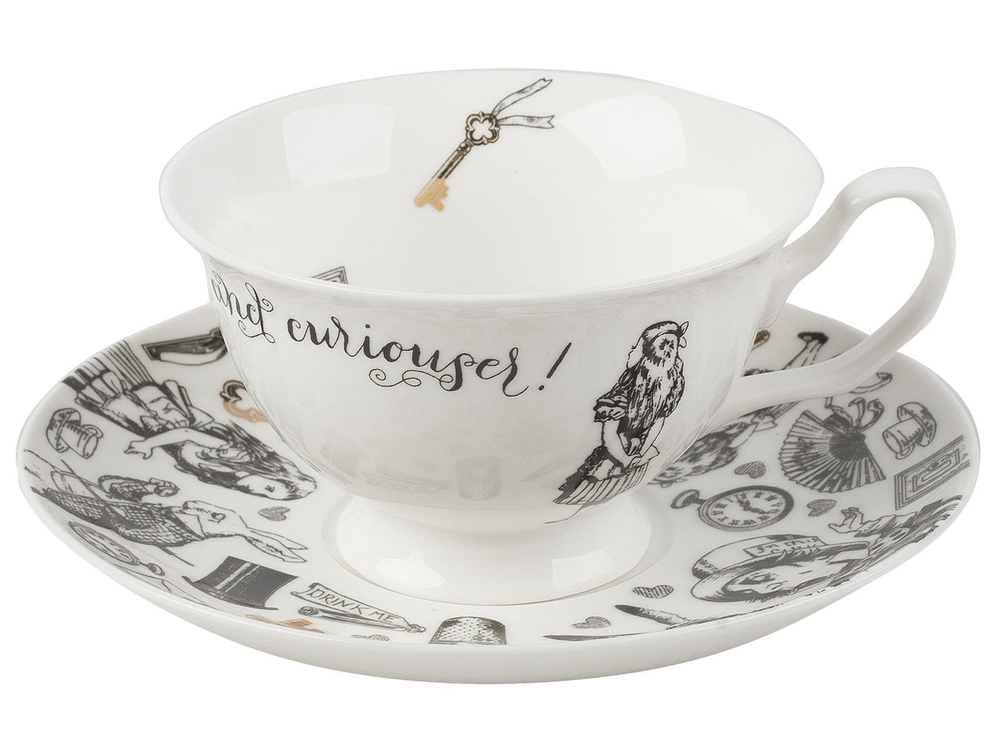 • Q: What characters are featured on the cup and saucer? A: The cup and saucer feature iconic characters from Alice in Wonderland, including the White Rabbit, Mad Hatter, and Alice, along with various whimsical items.