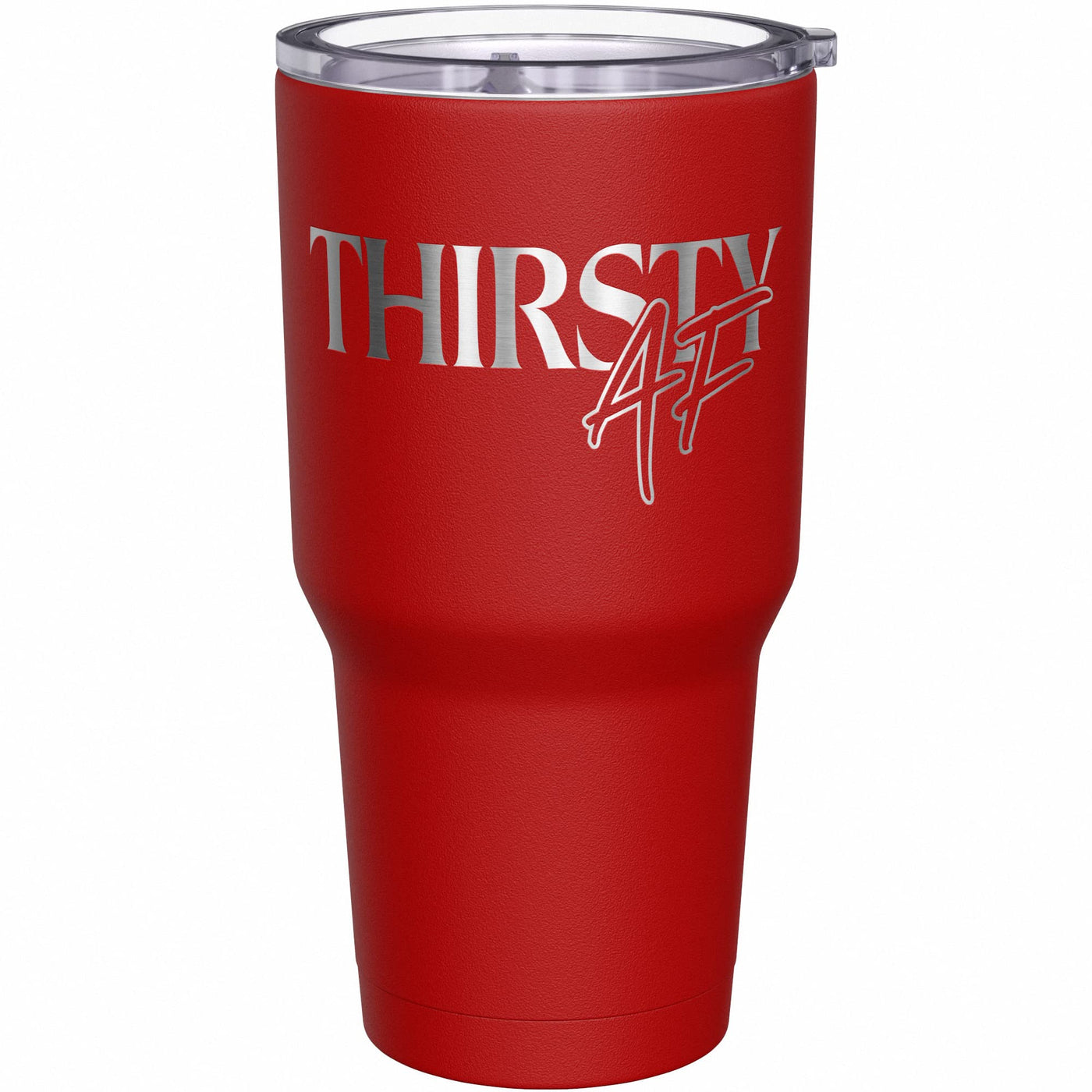 - Q: What design is featured on the tumbler? A: The tumbler features a patriotic design with the Thirsty AF print on one side and an American flag on the other.