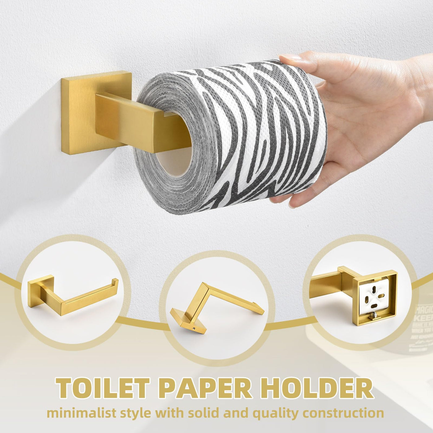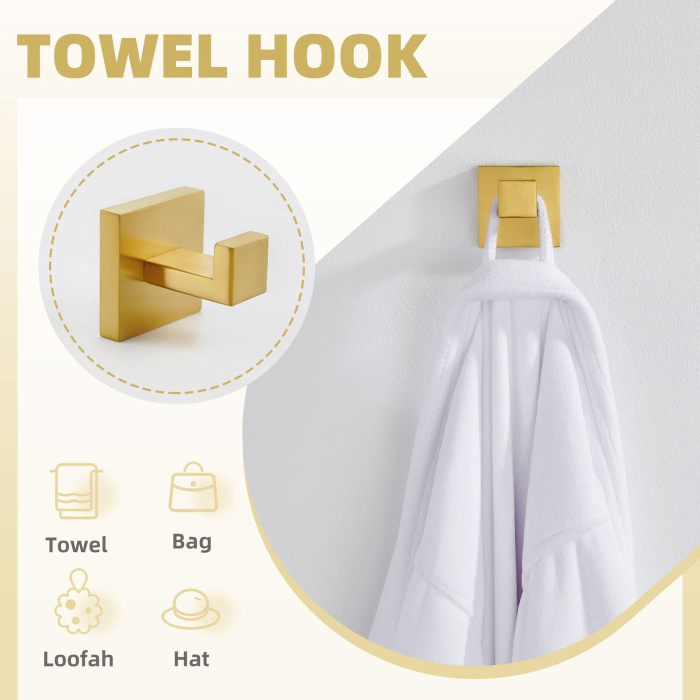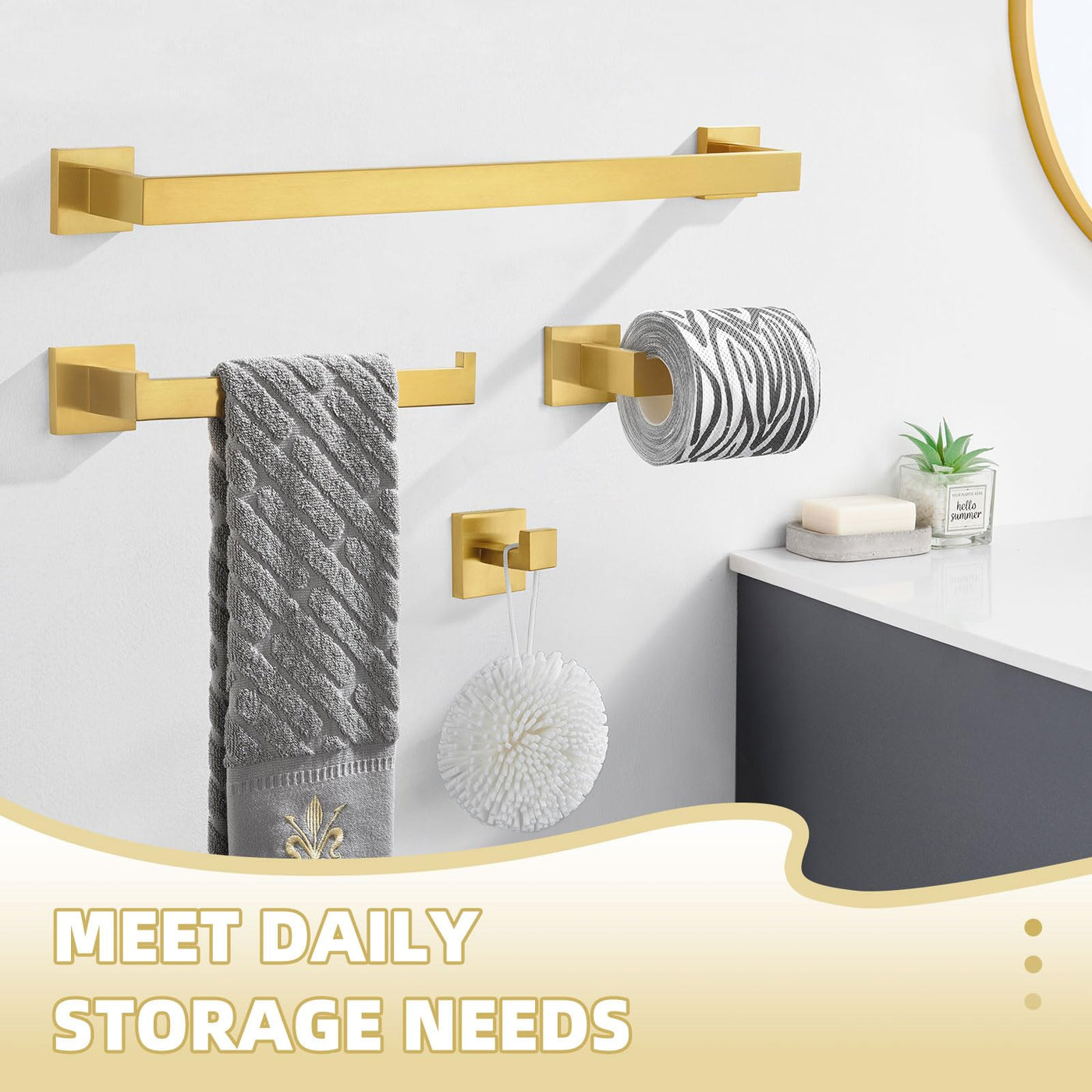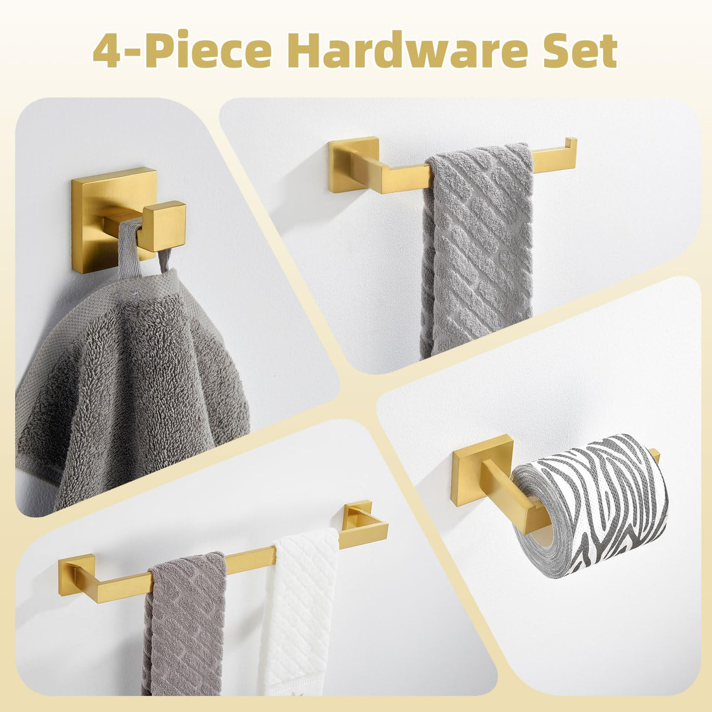 - Q: What items are included in this 4-piece set? A: The set includes a robe hook, a toilet paper holder, a towel holder, and a 23.74-inch towel bar, along with mounting hardware.