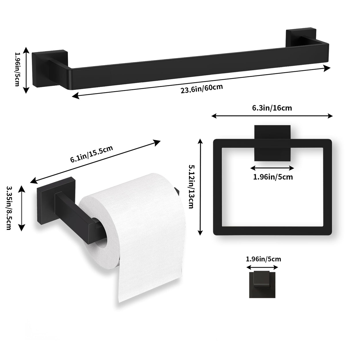 • Q: What is included in the 10-Piece Matte Black Bathroom Accessories Set? A: The set includes 2 x 23.6 Inch Towel Bars, 2 x Towel Rings, 2 x Toilet Paper Holders, and 4 x Towel Hooks.