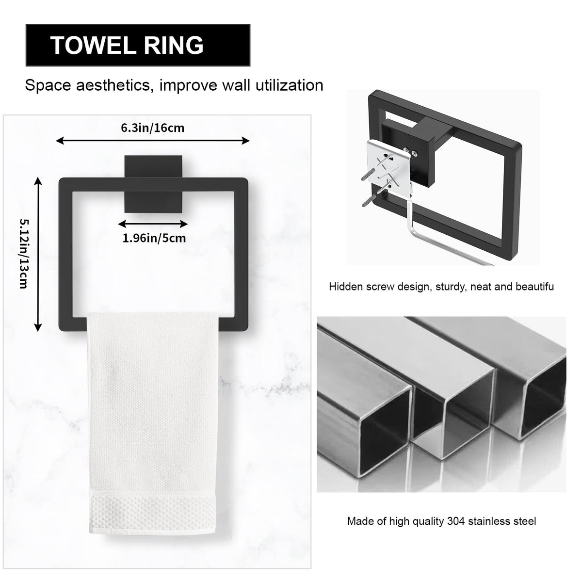 • Q: Can this bathroom accessories set match existing fixtures? A: Yes, the matte black finish is designed to complement various bathroom fixtures, including black shower faucets and bathroom faucets.