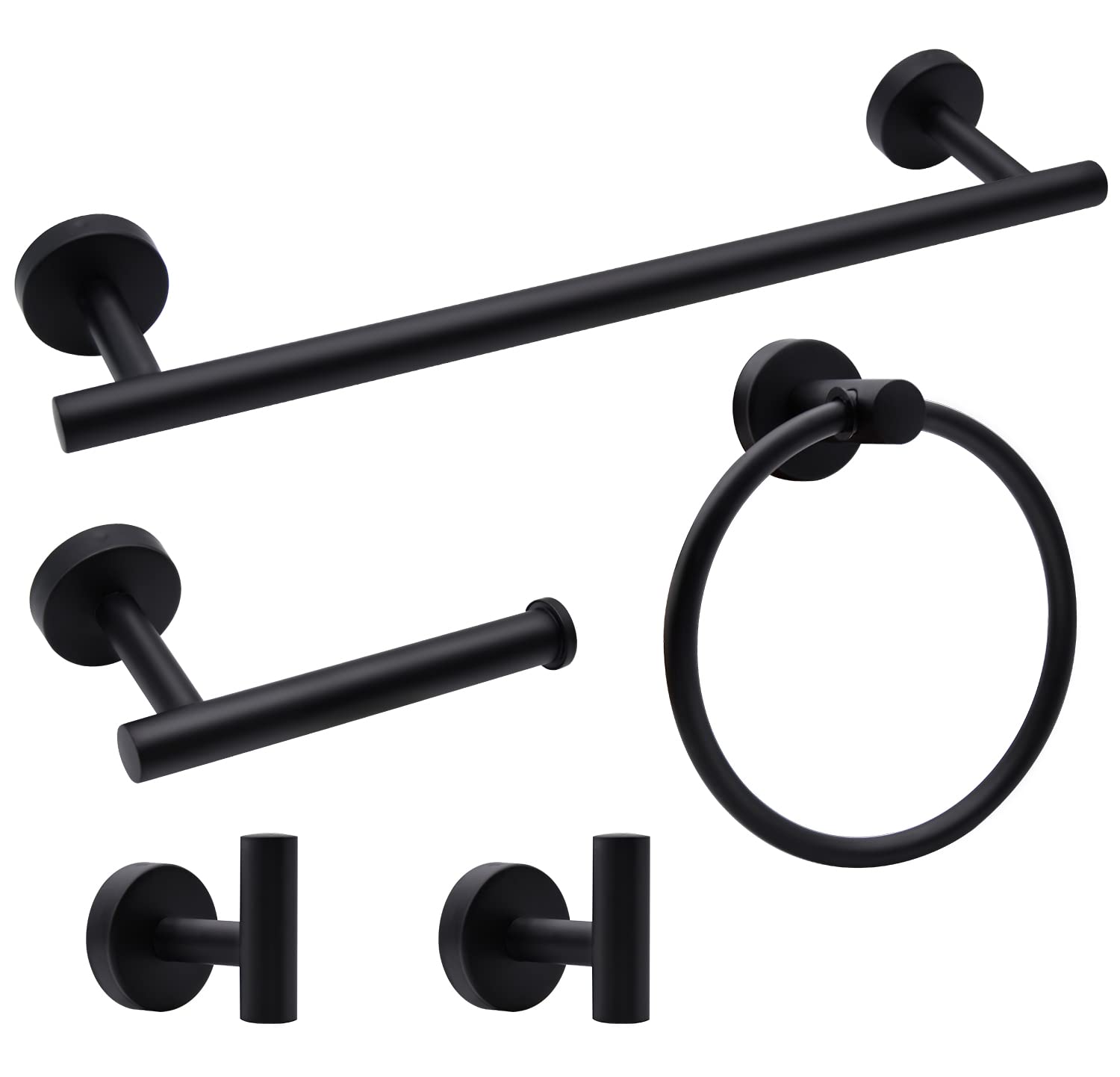 - Q: What is included in the bathroom hardware set? A: The set includes one hand towel bar, one toilet paper holder, one towel ring, and two robe hooks.