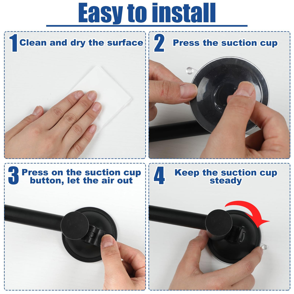 • Q: How do I install the adjustable suction cup towel bar? A: To install the towel bar, press it firmly against a smooth, flat surface such as glass or ceramic tile, then rotate the handle to lock it in place. For best results, ensure the surface is clean and dry.