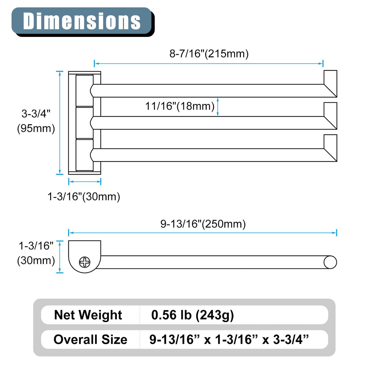 - Q: What are the dimensions of the towel rack? A: The dimensions are 9-13/16" (250mm) in length, 1-13/16" (30mm) in depth, and 3-3/4" (95mm) in height, with each holding bar measuring 8-7/16" (215mm).