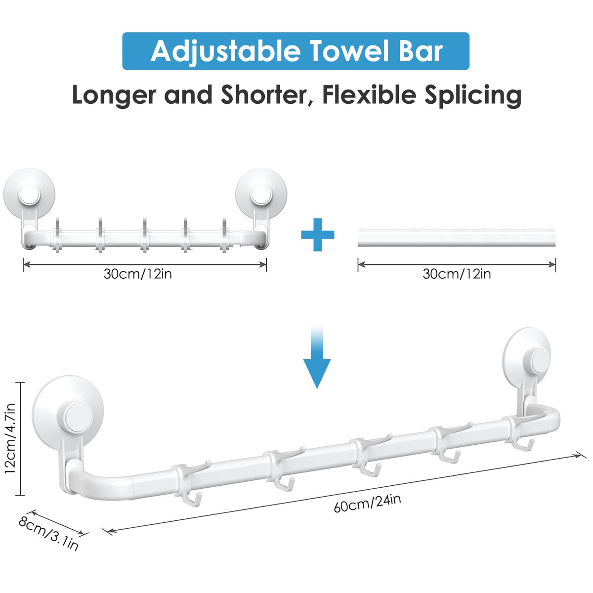 Avolare Suction Cup Towel Bar, Adjustable 24 Inches Adhesive Towel Holder For Bathroom, No Drill Wall Mounted Towel Rack With 5