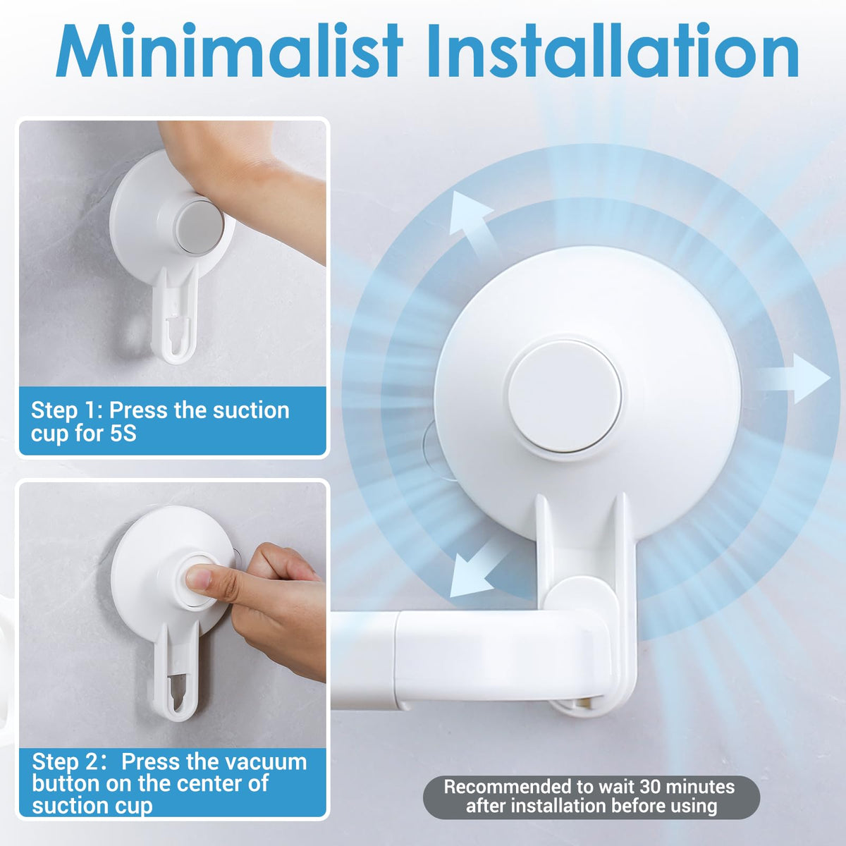 • Q: How do I install the Avolare Suction Cup Towel Bar? A: Installation is simple and requires no drilling. Clean and dry the surface, remove the plastic cover from the suction cup, press it against the surface for five seconds, and optionally press the vacuum button for extra stability.