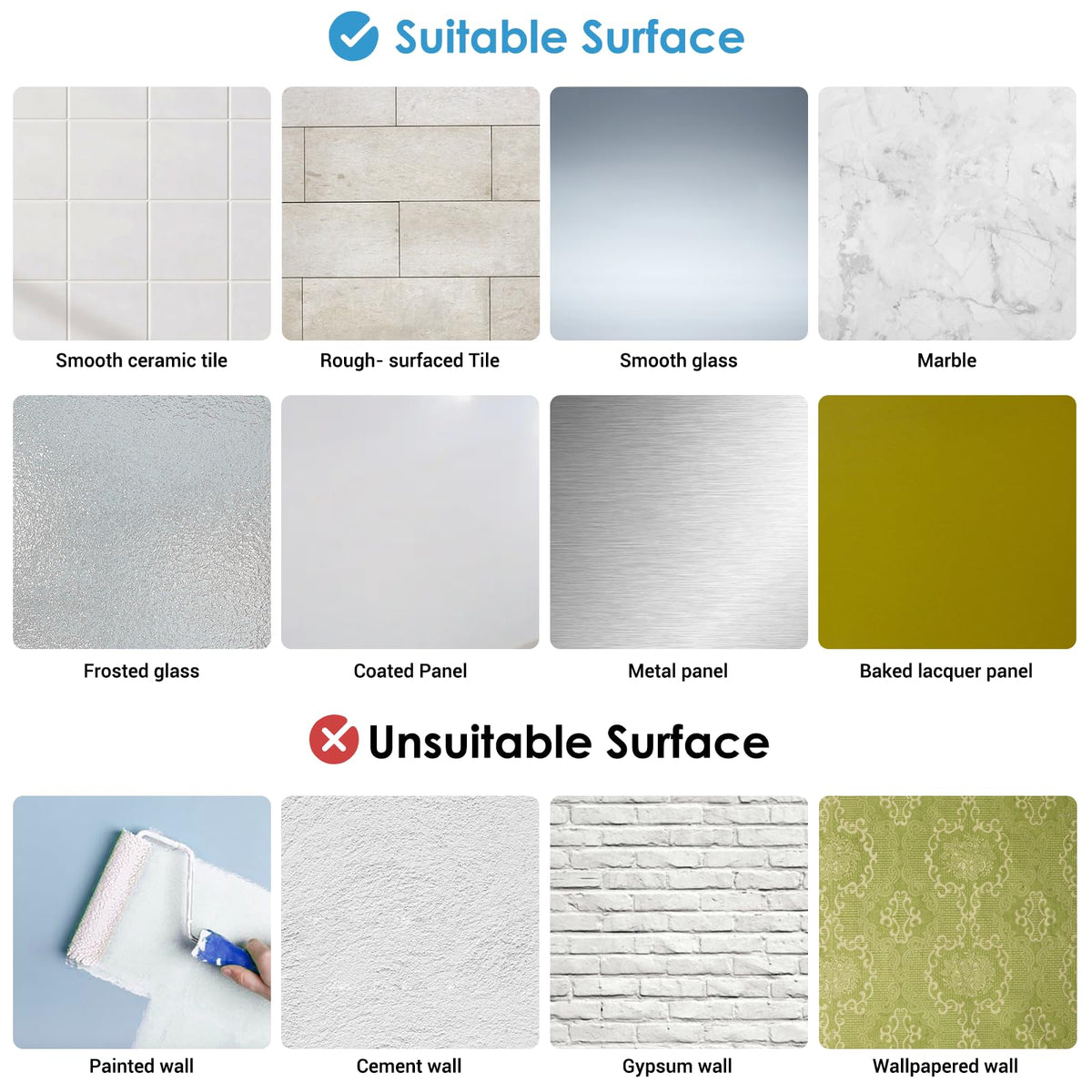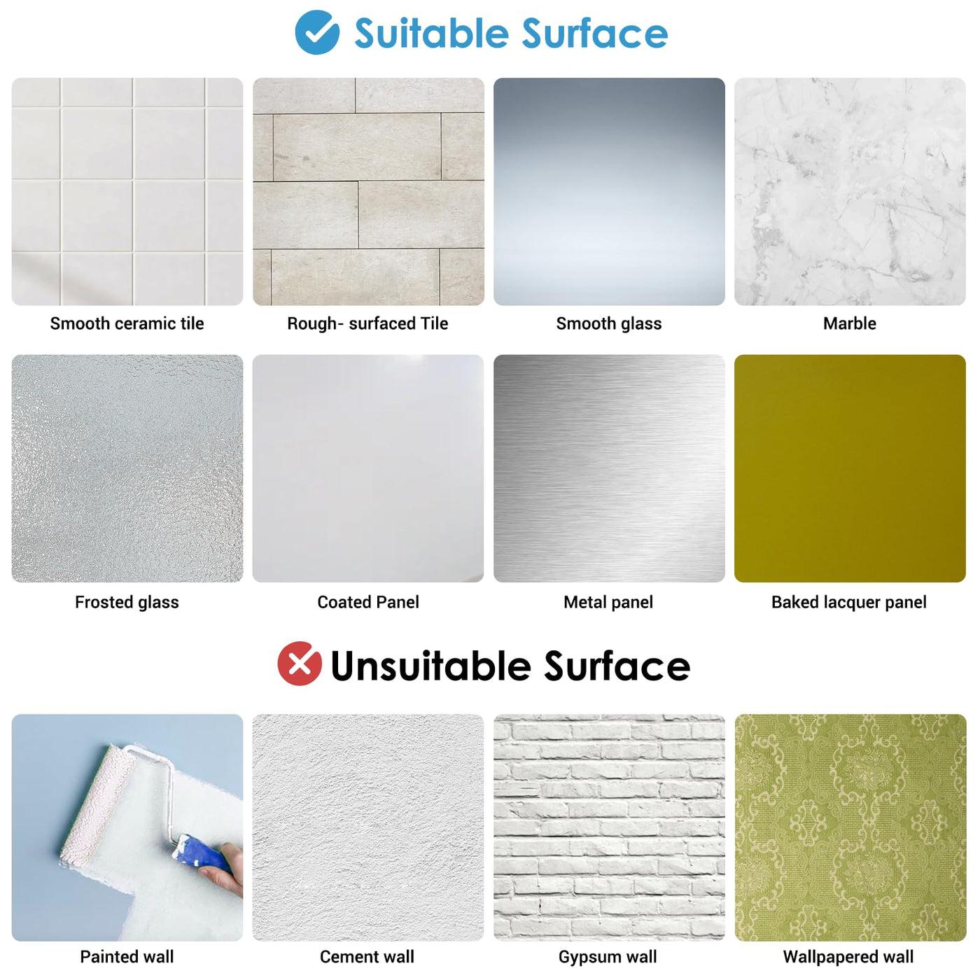 • Q: What types of surfaces can the towel bar be mounted on? A: The towel bar can be mounted on smooth surfaces such as walls, tiles, and glass. It can also adhere to cracked tile surfaces and rough glass.