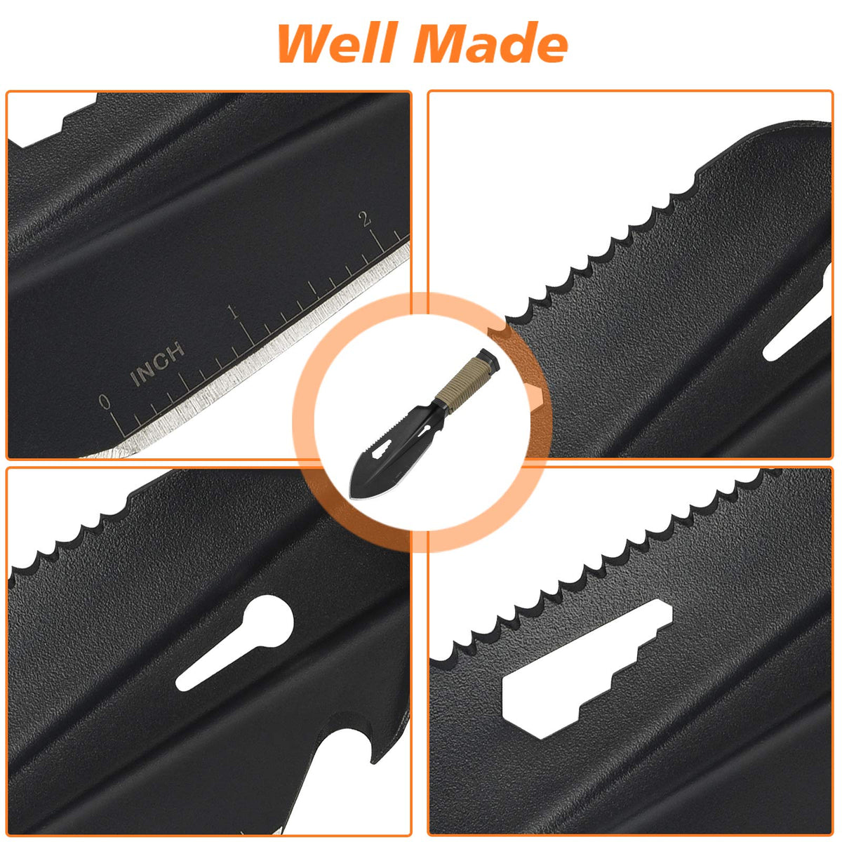 • Q: What features does the trowel include? A: The trowel includes several multifunctional tools such as a saw, ruler, hex wrench, nail extractor, and 110 inches of strong paracord.