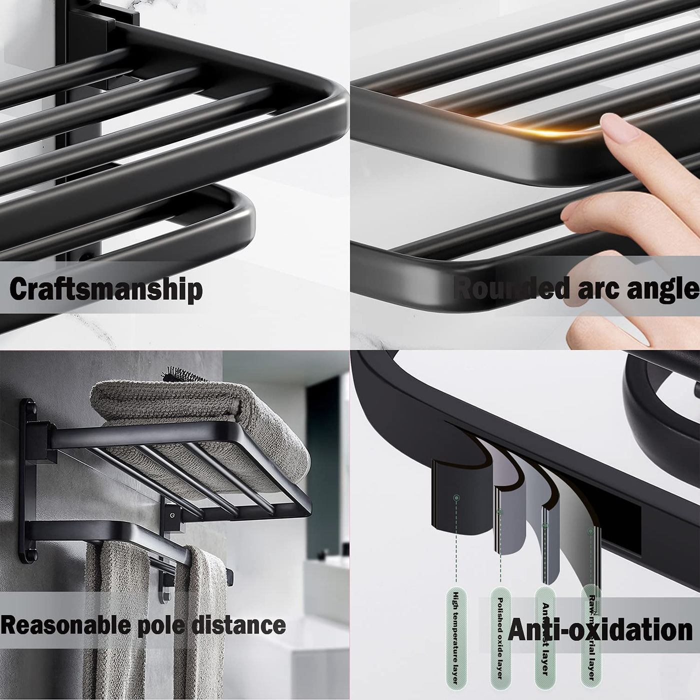 - Q: What finish does the towel rack have? A: The towel rack features a matte black finish, which adds a modern touch and complements various bathroom styles.