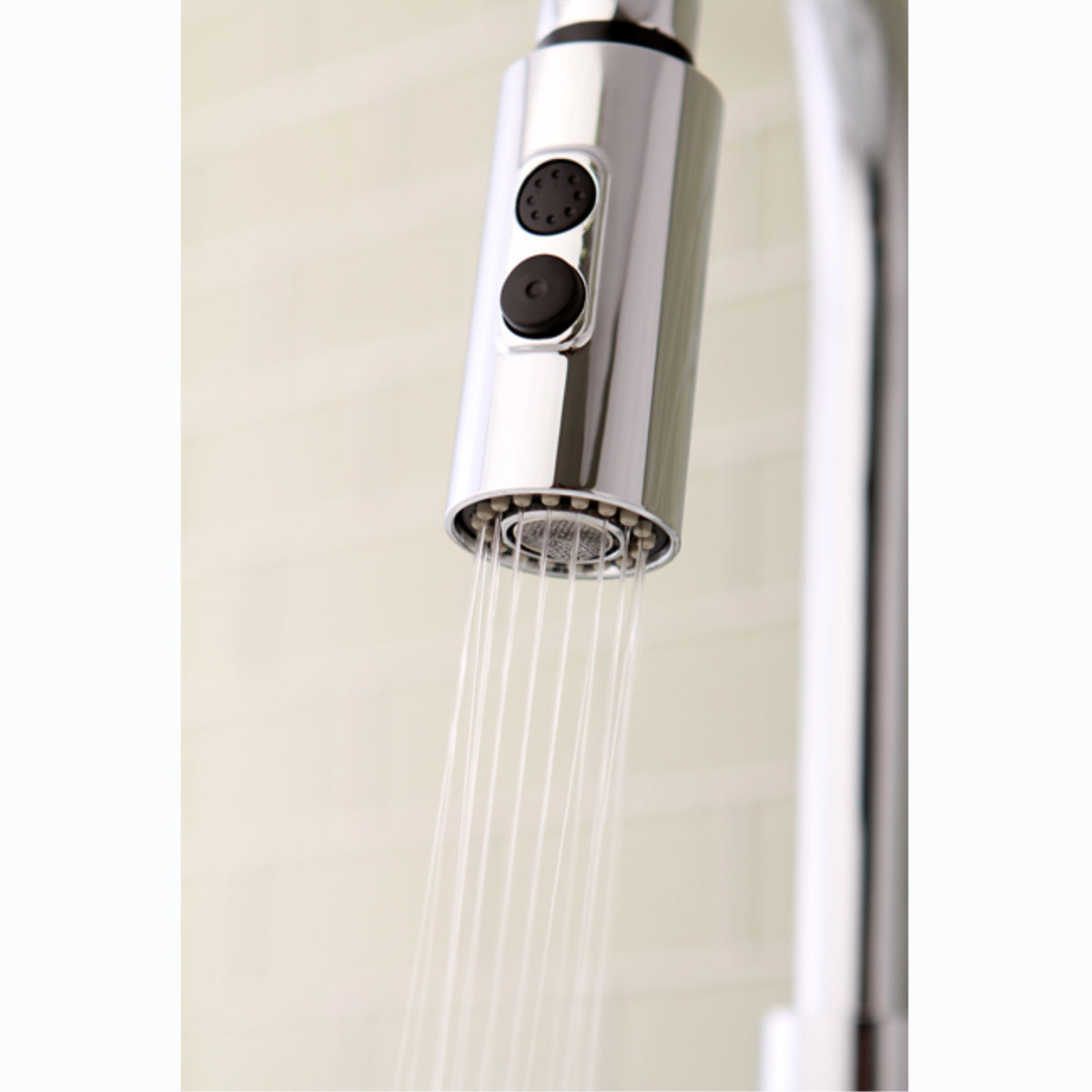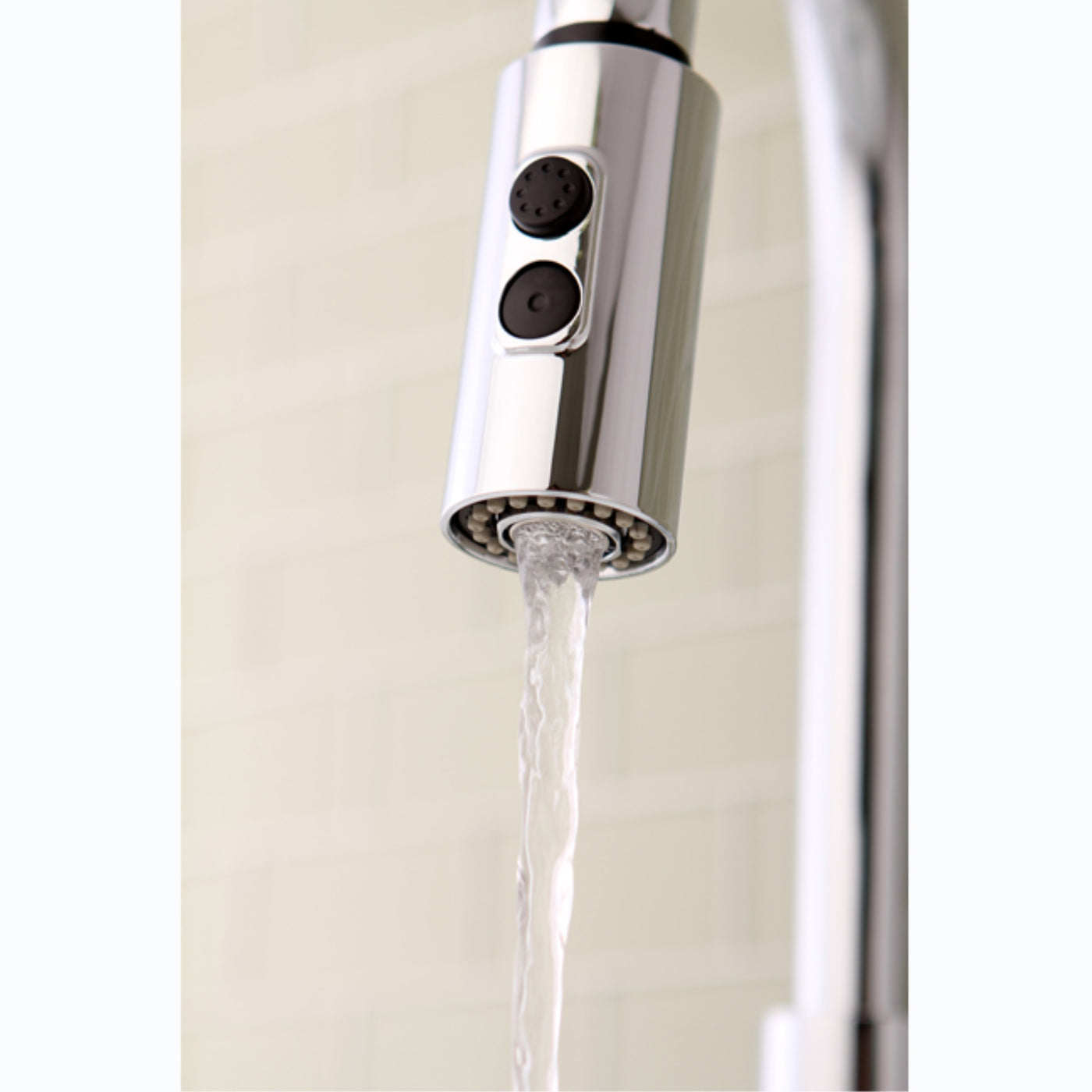 - Q: What are the key features of the Kingston Brass Gourmetier KDH8701 Pull-Down Kitchen Faucet Sprayer? A: The Kingston Brass KDH8701 features a 2-function spray head with a stream flow and jet spray option, backflow prevention, easy one-touch operation, and a maximum water flow rate of 1.8 gallons per minute at 60 PSI.