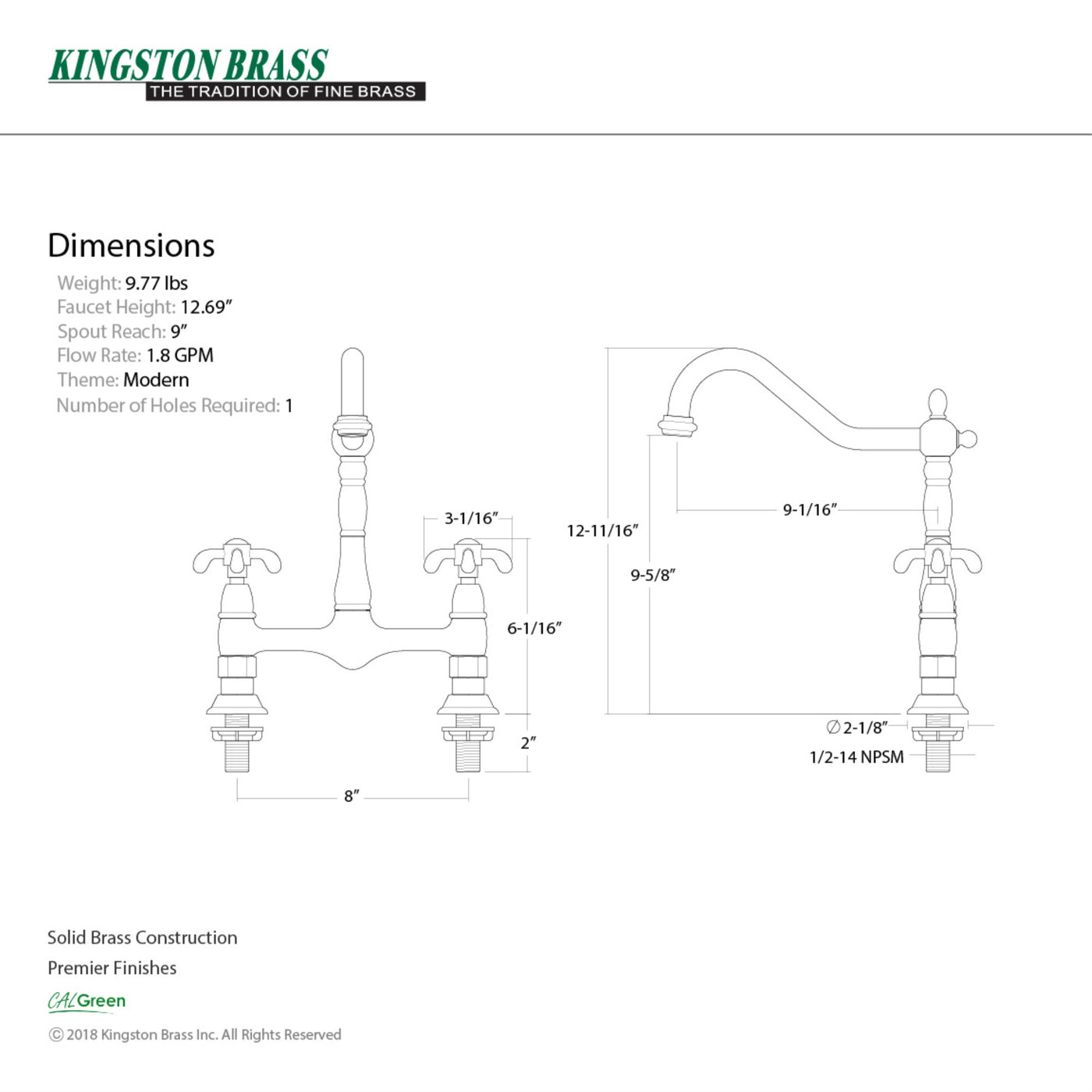 • Q: What is the water flow rate for this faucet? A: The maximum water flow rate for the Kingston Brass KS1175TX Bridge Kitchen Faucet is 1.8 gallons per minute at 80 PSI, complying with ASME standards.