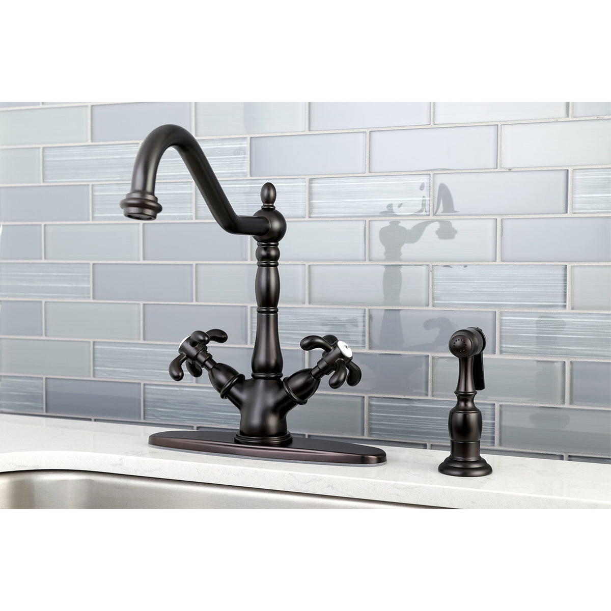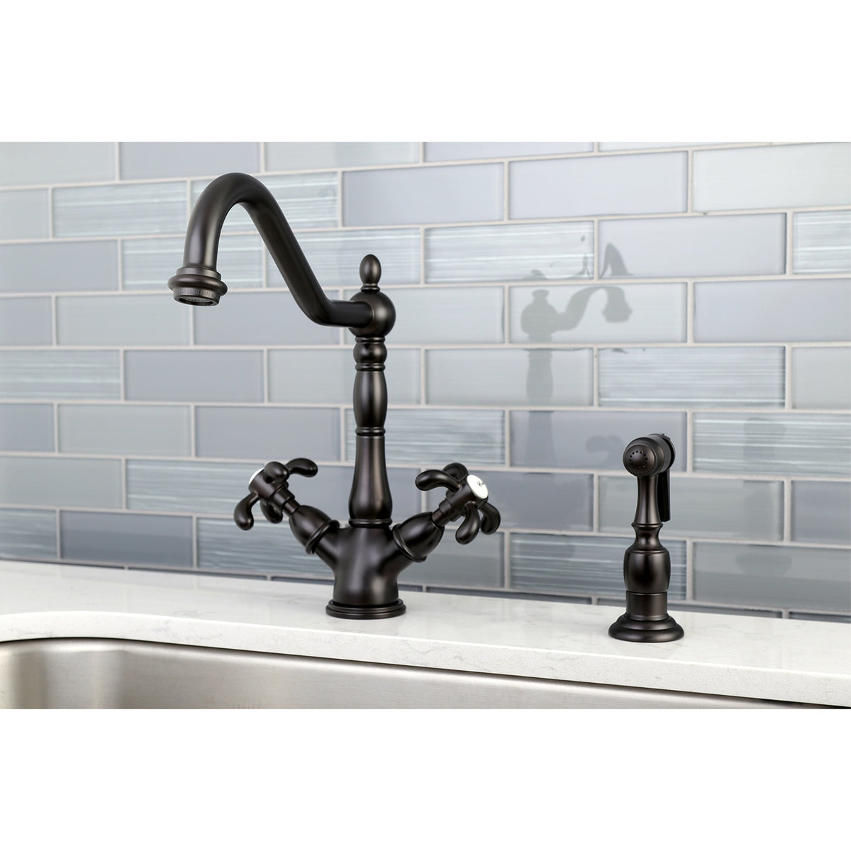 - Q: Does the Kingston Brass KS1235TXBS come with a sprayer? A: Yes, the Kingston Brass KS1235TXBS includes a brass sprayer that is mounted beside the faucet for added convenience.