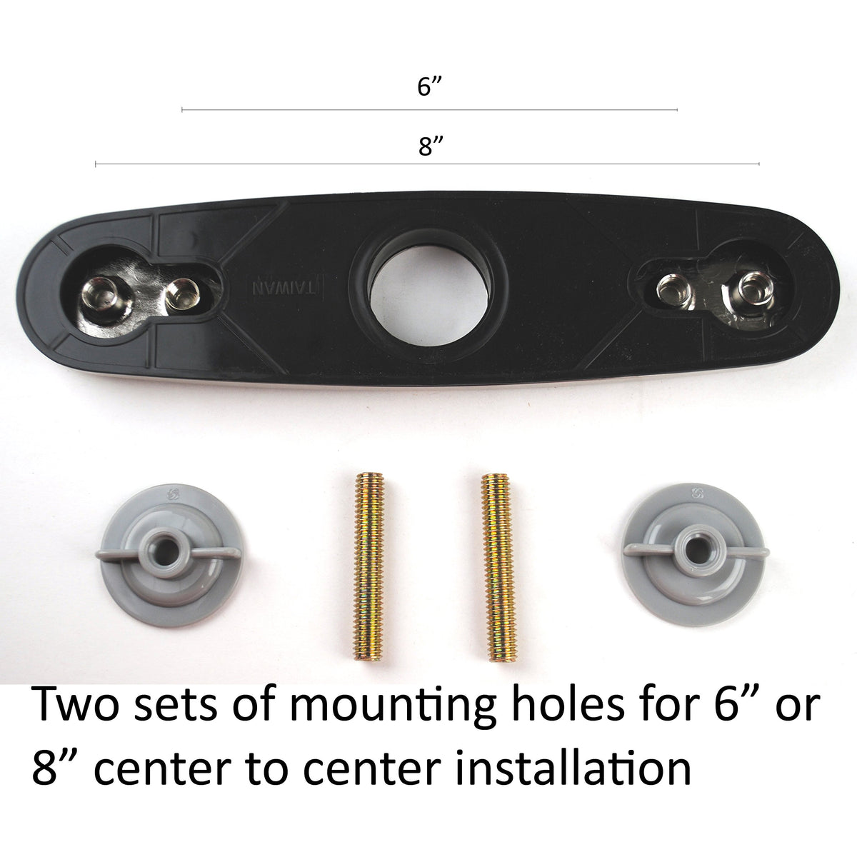 • Q: What are the mounting hole configurations for installation? A: The deck plate features two sets of mounting holes for either 6 inches or 8 inches center to center installation, providing flexibility based on your sink layout.