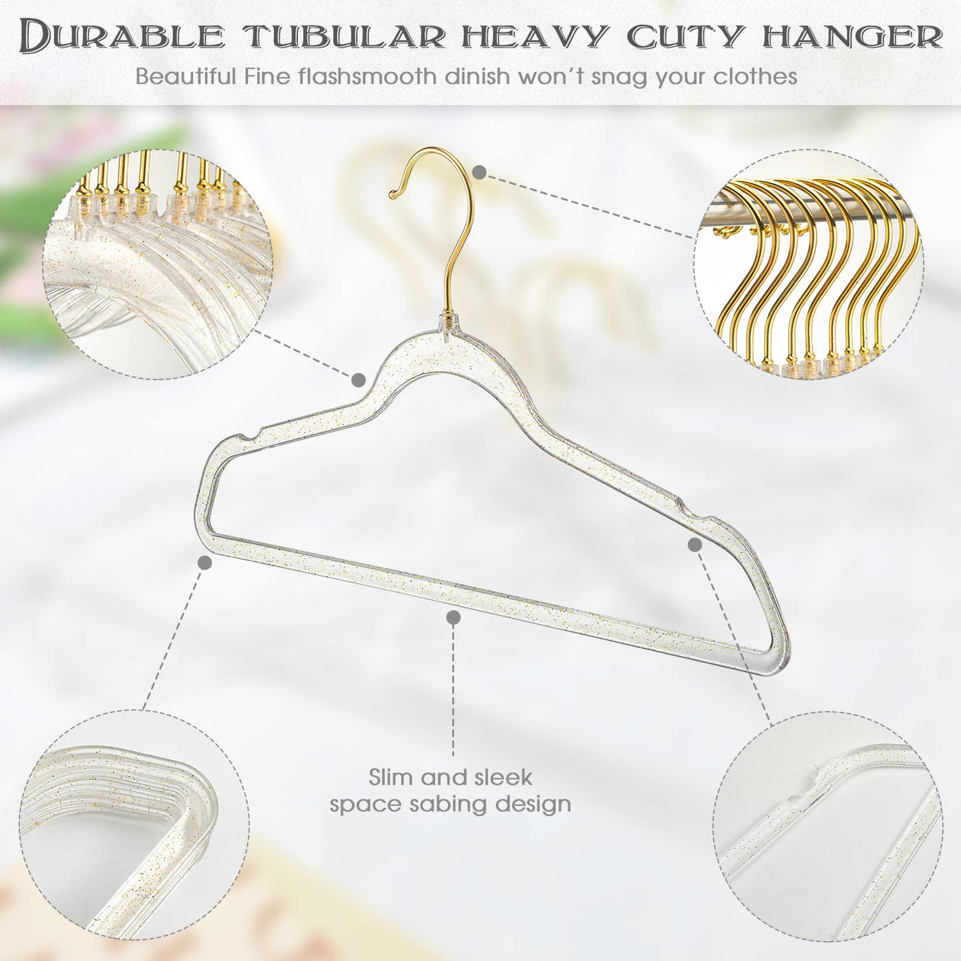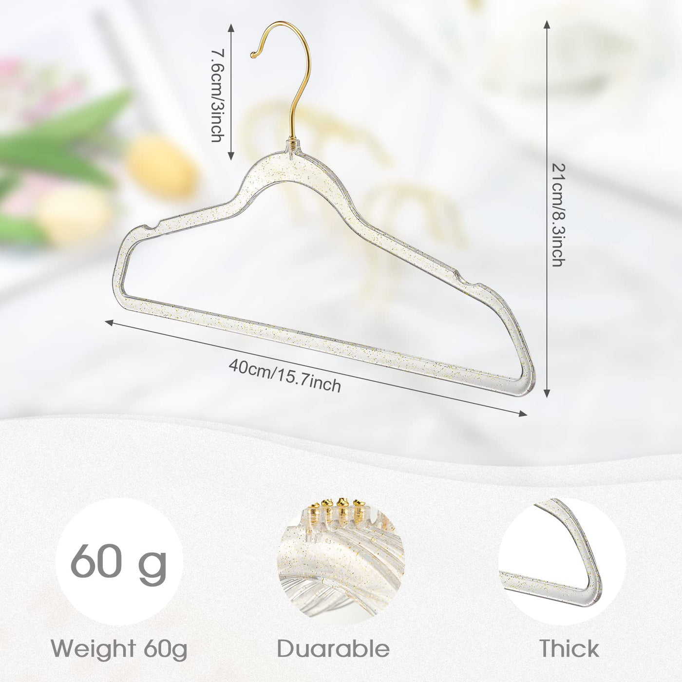 20 Pcs Clear Acrylic Hangers Plastic Glitter Coat Hanger Non Slip Space Saving Suit Hangers Heavy Duty Clothes Hanger with Non Slip Notches (Gold)