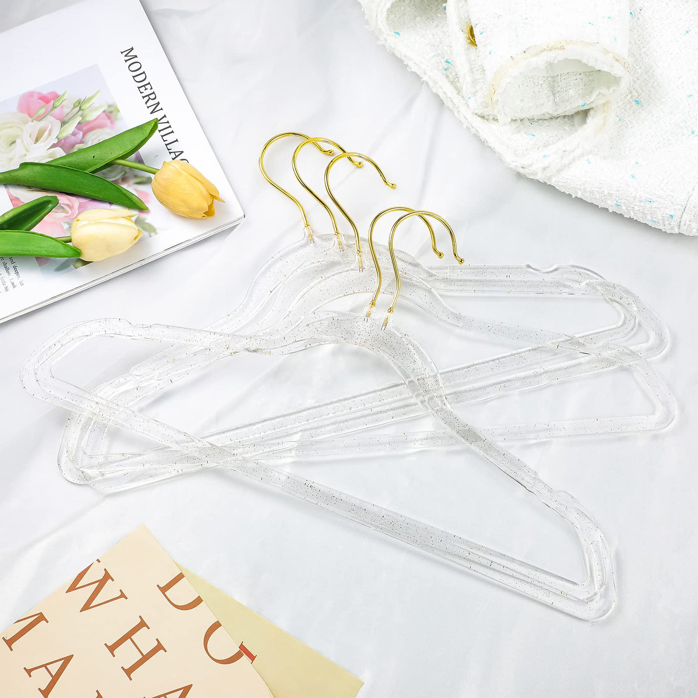 - Q: Do the hangers come in different colors? A: This particular set is designed in a clear acrylic with glitter and gold hooks, offering a chic look.