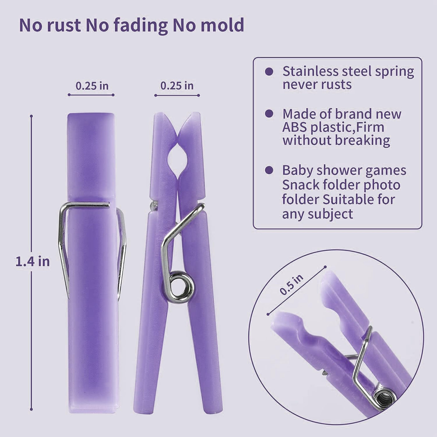 • Q: What colors are available for these clothespins? A: This particular pack features purple clothespins, which are great for baby showers and themed events.