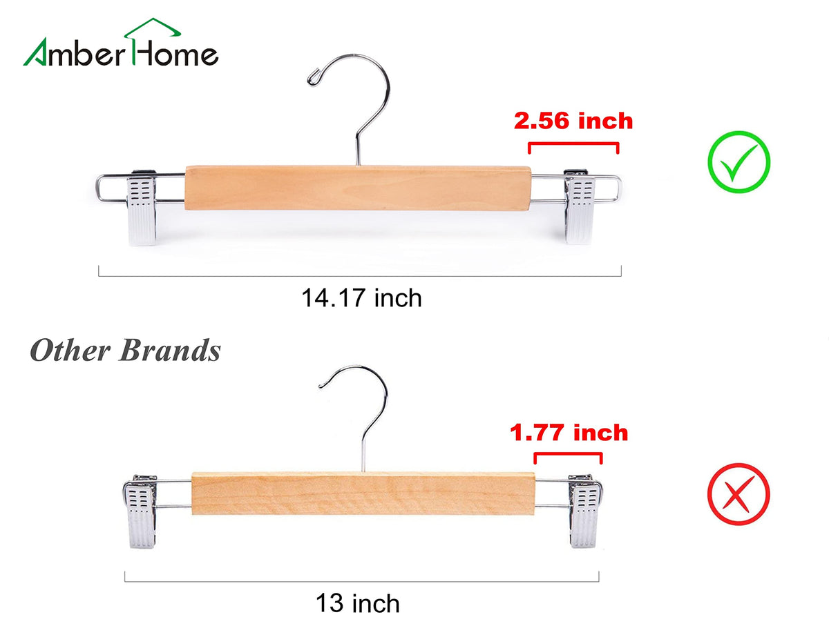 - Q: What are the dimensions of the Amber Home wooden pant skirt hangers? A: The Amber Home wooden pant skirt hangers measure 14.17 inches in length, 0.47 inches in width, and 5.12 inches in height.