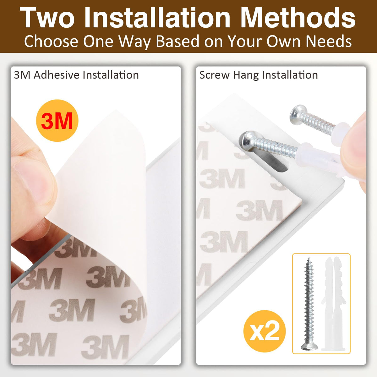 • Q: Is the adhesive installation method reliable? A: Yes, the 3M adhesive can withstand a weight of up to 10 lbs. For best results, adhere it to smooth surfaces like marble or glass and wait 24 hours before use.