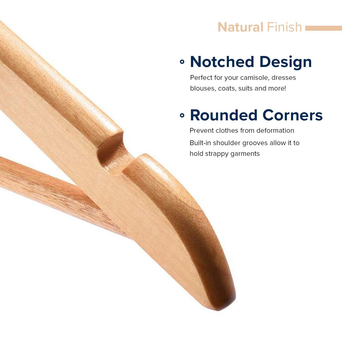• Q: Are the hangers designed to prevent clothes from slipping off? A: Yes, the wooden clothes hangers include precisely cut notches to secure strappy shirts, blouses, and dresses, preventing them from slipping off.
