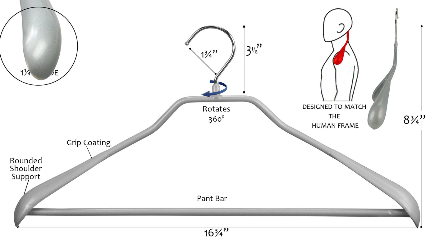 - Q: What are the dimensions of the Mawa BodyForm hanger? A: The Mawa BodyForm hanger measures 16.5 inches wide, 9 inches high, and has a shoulder support width of 1.25 inches.