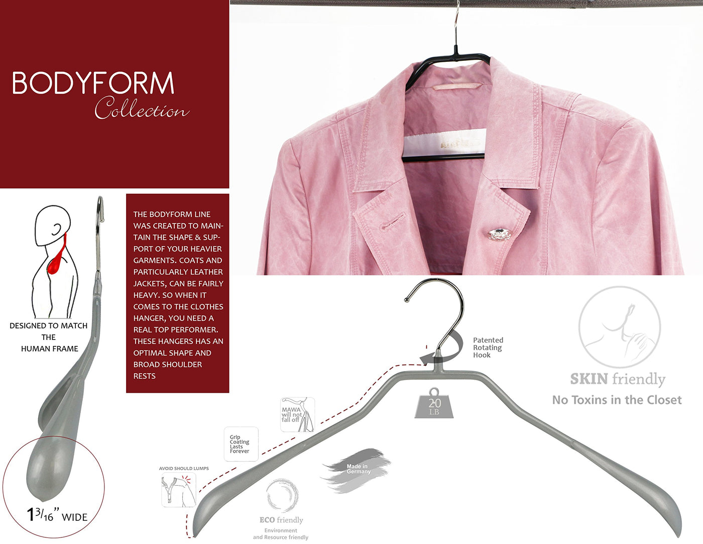 • Q: What makes the BodyForm Series different from standard hangers? A: The BodyForm Series hangers are designed to mimic the human frame, providing better support and maintaining the shape of tailored garments.